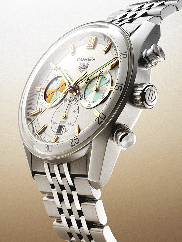 Cette nouvelle Carrera Seafarer est équipée du bracelet TAG Heuer en acier sept rangs, une version sophistiquée revisitant le design « grain de riz ». De plus, chaque montre est accompagnée d’un bracelet sport dans un coloris beige, dont la doublure est assortie aux détails Intrepid Teal du cadran.
