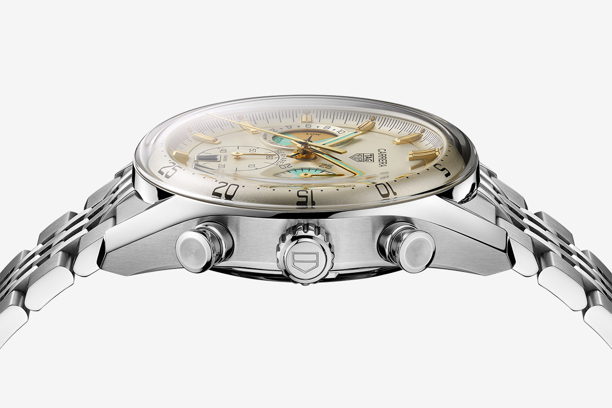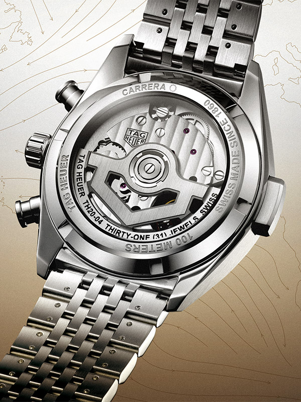 Le boîtier de 42 mm est réalisé dans une association d’acier brossé et poli qui contraste avec le cadran opalin champagne. Au dos, la montre dévoile un fond en verre saphir, gravé d’une couronne de la victoire signature de TAG Heuer. Ce verre permet de voir le calibre qui comprend un embrayage vertical et une roue à colonnes afin d’assurer, notamment, le bon fonctionnement des poussoirs du chronographe.