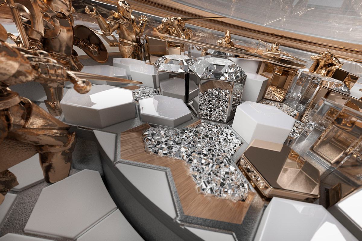 Au sommet de chacune des 9 colonnes en or plaqué rhodium trône un diamant de forme hexagonale, une taille masculine rarement utilisée dans l’artisanat du diamant. Plutôt que d’être arrondie à la base, la pierre a été taillée dans son intégralité, de façon à révéler ses arêtes distinctives sous tous les angles et à amplifier les jeux de lumière. Pour la première fois, Roger Dubuis a utilisé la technique du « serti invisible », avec laquelle chaque diamant est inséré dans des gorges dissimulées dans l’or. La fluidité du rendu est telle, que la scène tend vers l’illusion.