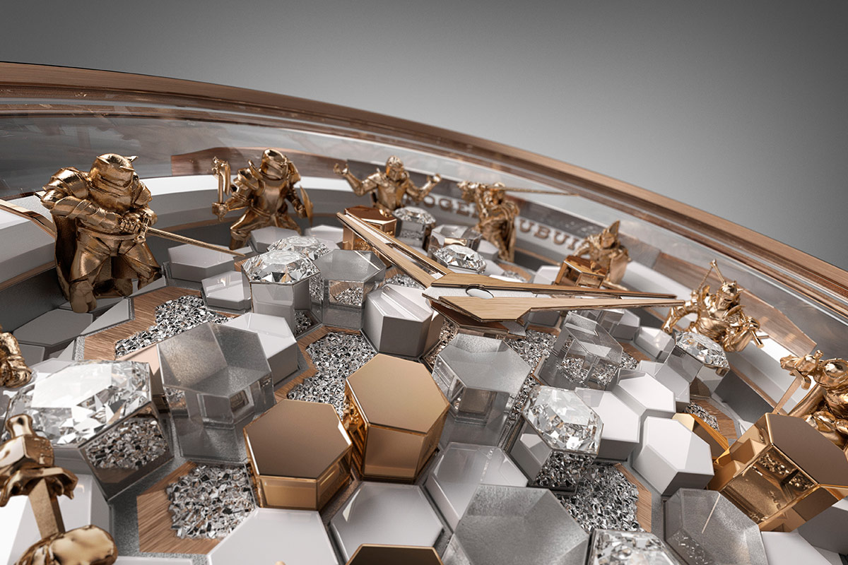 Comme une ode au palais de cristal de Merlin, la face de ce nouveau garde-temps fait écho aux motifs hexagonaux du premier chapitre, en les déclinant dans des matériaux réfléchissants et en utilisant des techniques spécifiques.
