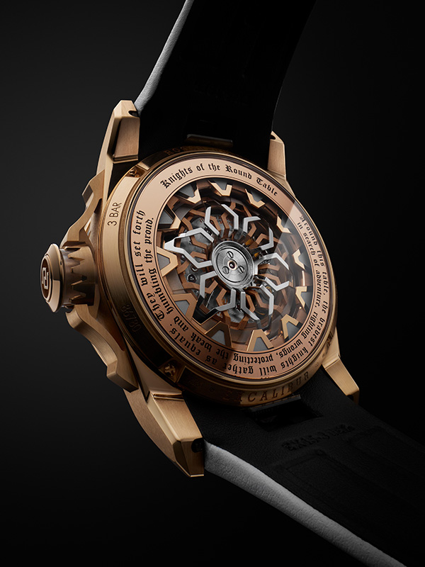 Le calibre se loge dans un boîtier de 45 millimètres en or rose 18 carats. Ce dernier est doté d’un protège-couronne qui arbore la forme de la garde d’une épée, symbolisant la légendaire Excalibur qu’Arthur retira du rocher, pour consacrer son destin royal. En retournant la montre, le dos du boîtier révèle la masse oscillante à 360° inspirée des vitraux élaborés des châteaux médiévaux, avec ses bras en or rose 18 carats plaqué rhodium.