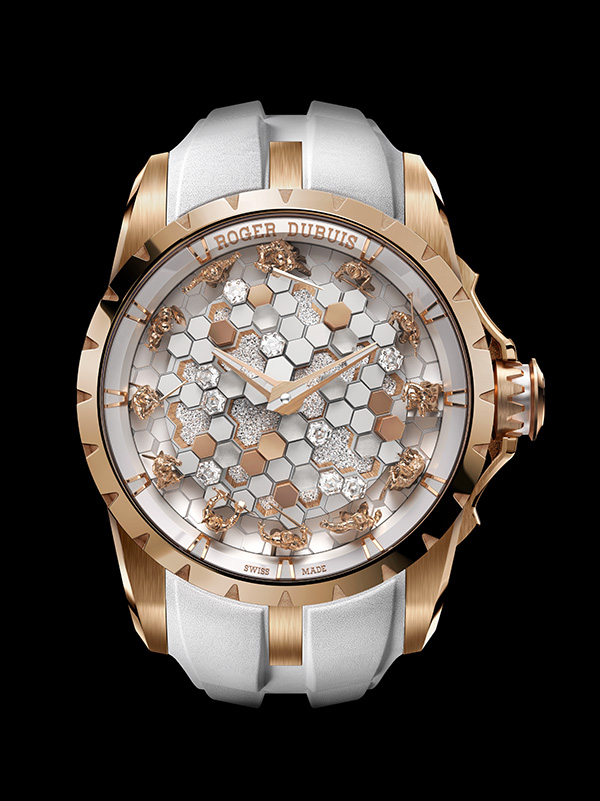 Soulignant le thème de la protection, les 12 chevaliers arthuriens sont disposés autour du cadran, en gardiens de la Dame du lac. Ils se tiennent devant un rehaut blanc en verre de style Murano. Le rehaut lui-même est une construction élaborée de deux parties. Il affiche le nom « Roger Dubuis » et porte des index en or rose 18 carats. Chaque chevalier défend son heure en adoptant une pose unique, dont il émane une présence singulière. Loin d’être statique, chaque scène dégage une impression de mouvement. Les épées sont levées, les armures bien fixées et la personnalité de chaque héros est gravée dans le métal.