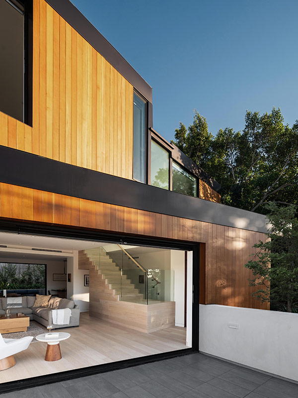 Signée par le cabinet ANX / Aaron Neubert Architects, la conception de cette maison repose sur une stratégie de stratification par éléments, jouant sur le creusement, la retenue et la création de ponts pour s’adapter au terrain. Le garage est encastré dans la colline, formant une base solide pour les deux niveaux habitables situés au-dessus.