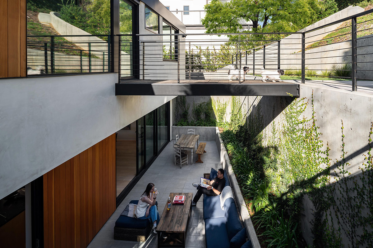 Cette approche permet à la structure de se fondre dans la pente, où une série de murs de soutènement crée une terrasse arrière intime, sculptée dans la terre et abritée par le paysage environnant. Cette atmosphère introspective offre un contraste apaisant avec la façade plus ouverte sur la rue.