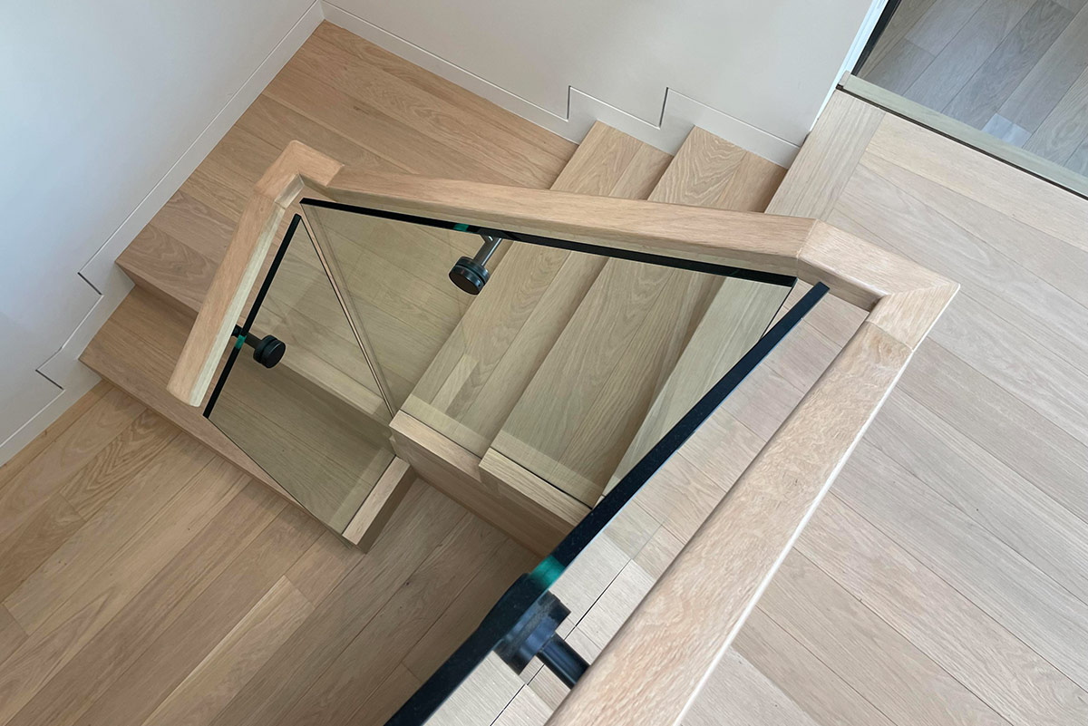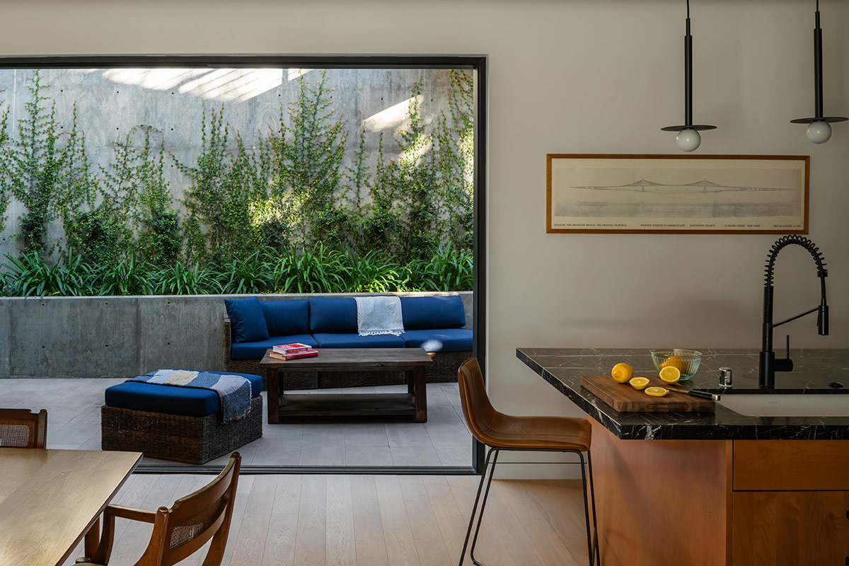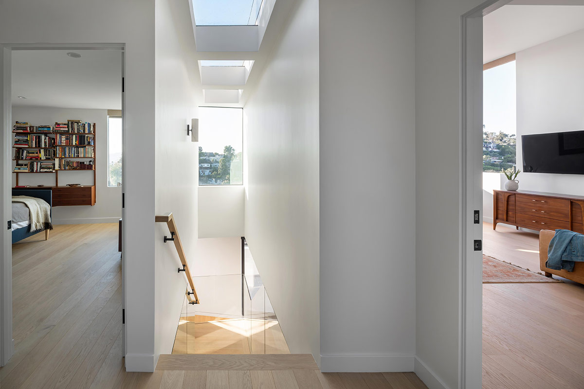 Au cœur de la résidence, une verrière continue, alignée sur les vues à chaque extrémité, l’escalier, le couloir et la passerelle, inonde l’intérieur de lumière naturelle. Cette ouverture linéaire crée un couloir visuel depuis le porche donnant sur la rue jusqu’à la terrasse arrière, renforçant la continuité spatiale et diffusant la lumière naturelle le long de l’axe de circulation principal.