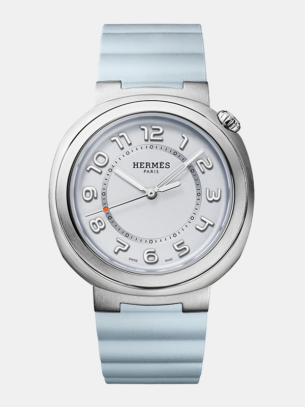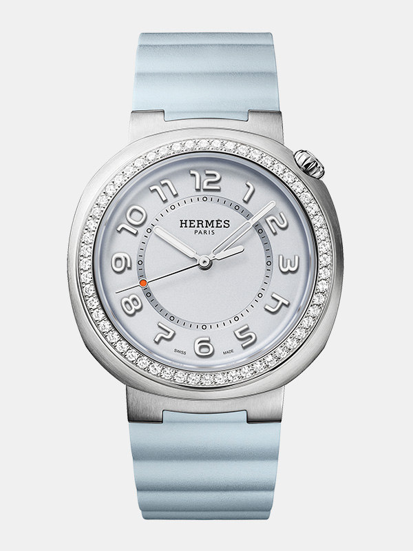 Hermès Cut accueille désormais une nouvelle teinte de cadran empruntée aux nuances aériennes du ciel, rehaussée d’une lunette ronde en acier poli ou serti de 56 diamants.