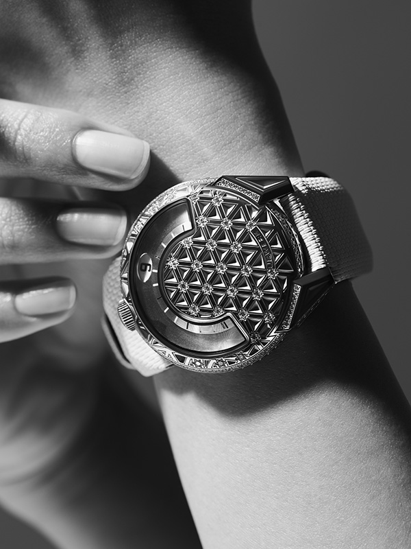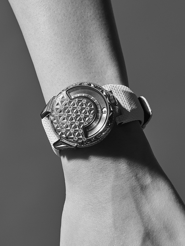« Les diamants sont autant de points lumineux, nous orientant à la manière des astres. Leur disposition hexagonale obéit à un principe clair : dans l’espace, les étoiles témoignent des lois de la nature. Sur notre cadran, elles créent un équilibre, relient le haut et le bas, et traduisent la vision du design en une structure simple et régulière », confie Martin Frei, cofondateur d’Urwerk et directeur artistique de la marque.