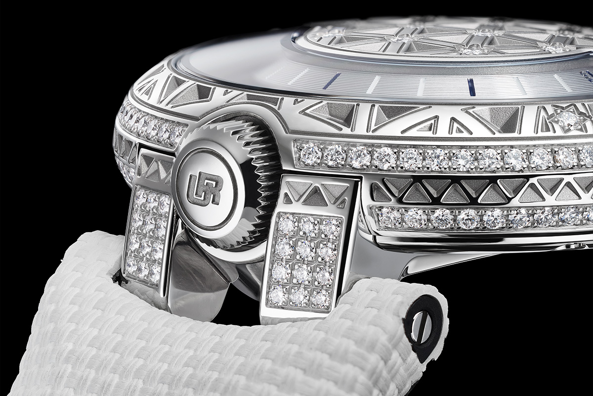 Avec cette magnifique création, Urwerk explore un territoire qu’elle a rarement foulé : celui où la mécanique horlogère dialogue frontalement avec l’art joaillier, sans compromis ni hiérarchie. Le boîtier en acier devient une cartographie cosmique, gravée mécaniquement d’un réseau géométrique évoquant une constellation abstraite. À chaque intersection, un diamant. Non pas posé, mais intégré comme un point de repère, une étoile fixe dans un univers en mouvement.
