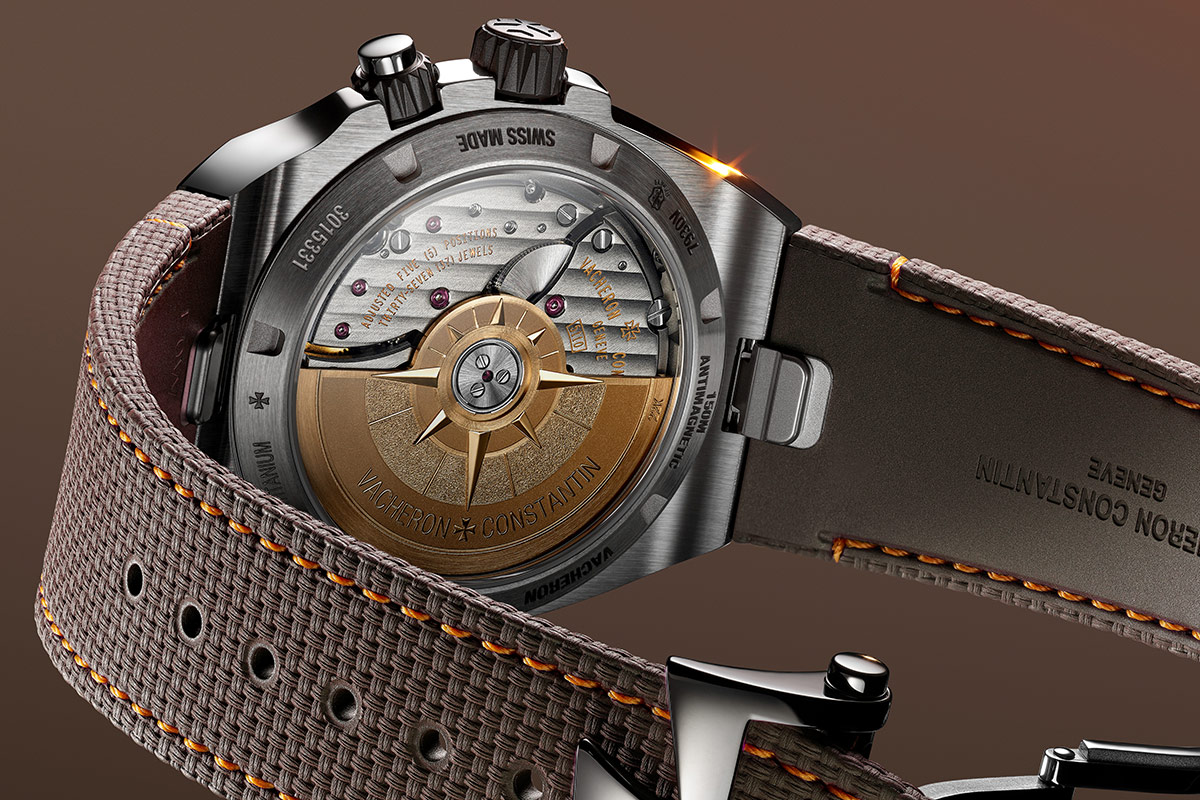 Un traitement NAC gris foncé sur les ponts fait écho au titane du boîtier et contraste le train de rouage et la masse oscillante en or, gravée de la rose des vents. Parmi les terminaisons, on notera le perlage appliqué sur la platine, ou encore les côtes de Genève sur les ponts.