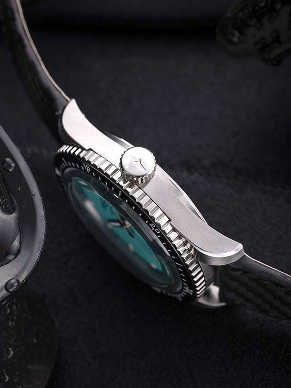 Le cadran éblouit par sa magnifique teinte bleu turquoise mat. Les index des heures varient entre forme ronde, triangulaire ou rectangulaire. Ils s’accompagnent de deux aiguilles bâton polies qui indiquent les heures et les minutes. Ces indicateurs sont revêtus de superluminova blanc et la fine trotteuse polie de couleur grise assure le décompte des secondes.