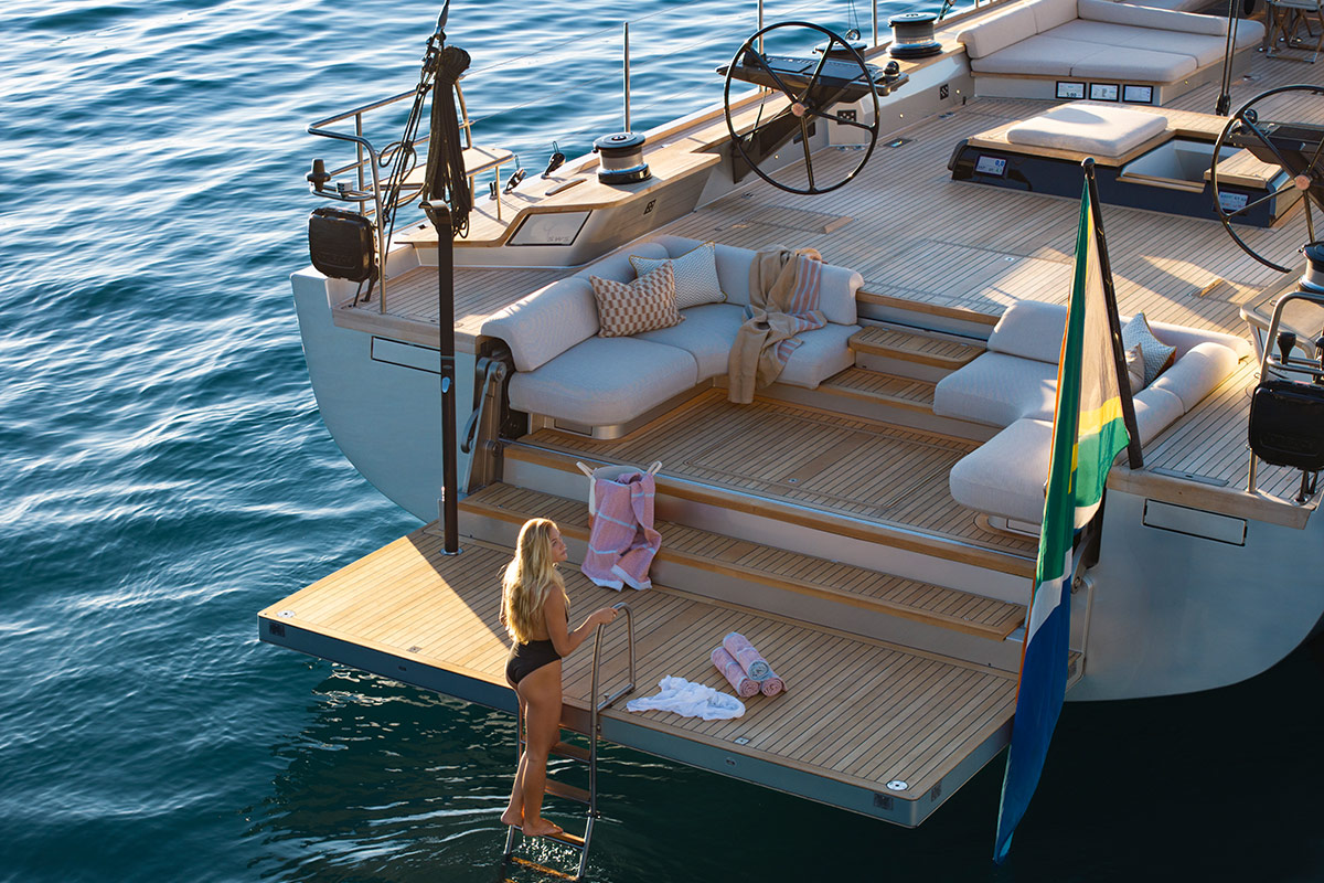 L’atout majeur du Kalantis est son Seaside Lounge unique, un espace transformable sur le pont arrière qui crée un lien direct avec la mer. Grâce à un système innovant, développé conjointement par Southern Wind et Nauta, le tableau arrière se déploie pour révéler un espace luxueux inattendu et surprenant : une vaste terrasse au niveau de l’eau, invitant les convives à vivre à quelques centimètres de la surface.