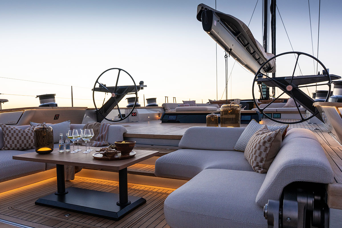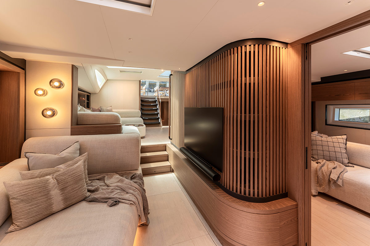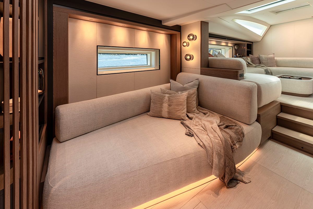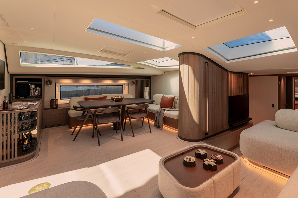 Grâce aux larges hublots de coque dans toutes les cabines et le carré, complétés par un puits de lumière sur le roof avant, la lumière naturelle est omniprésente et met subtilement en valeur un contraste de tons clairs et foncés, renforçant la sensation d’espace et de chaleur.