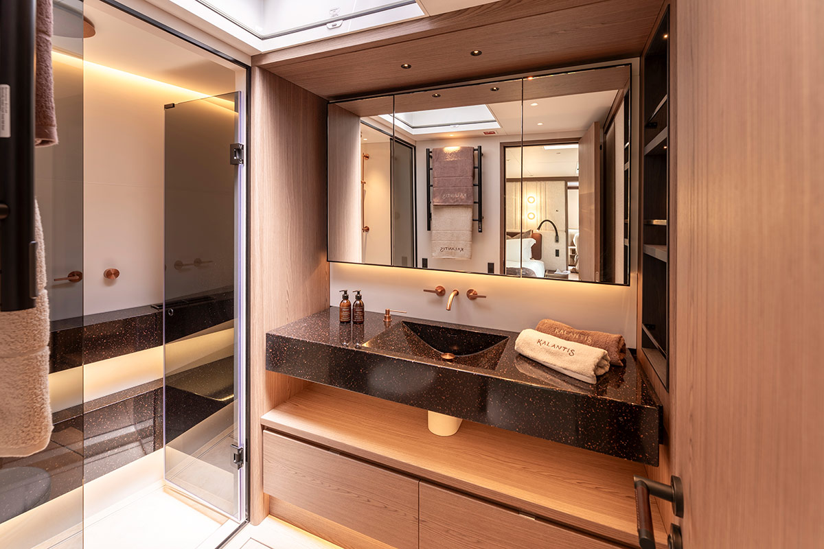 Kalantis dispose de quatre cabines : la suite propriétaire à l’avant, une cabine invités à l’avant du carré et deux cabines invités convertibles à l’arrière, toutes avec salle de bain privative. Le carré et la salle à manger, espaces de vie ouvert, accentuent la sensation d’espace.
