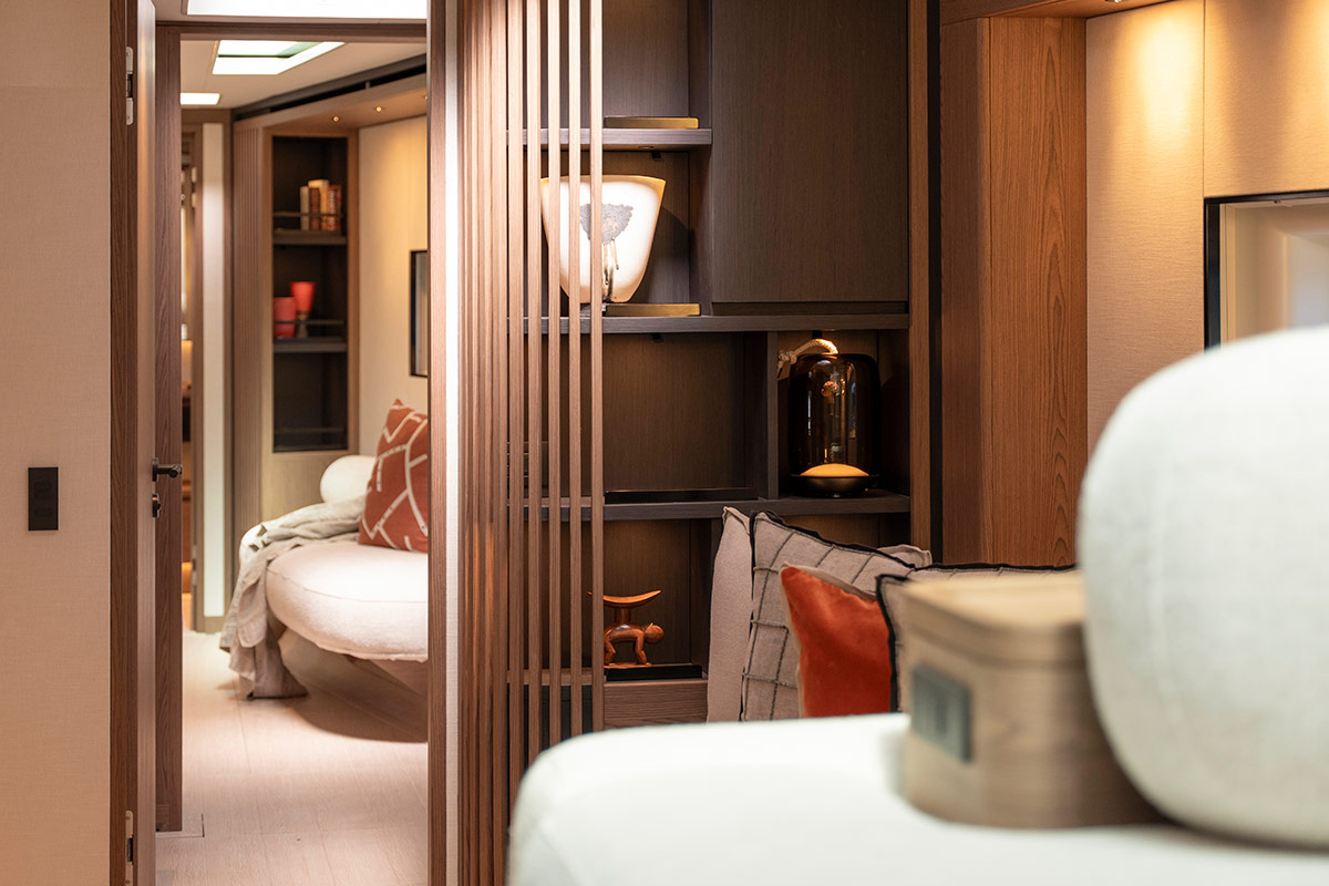 L’un des éléments les plus remarquables est le revêtement du puits de quille, orné de lattes en noyer qui se prolongent dans la cloison adjacente, créant un mouvement subtil que l’on retrouve dans tout le yacht, des tables de chevet aux rangements en passant par les étagères. Des détails subtils, comme les éléments noirs et les tissus d’ameublement Loro Piana sur les portes de placards et les canapés, apportent une touche contemporaine, renforçant l’impression de luxe et de confort.