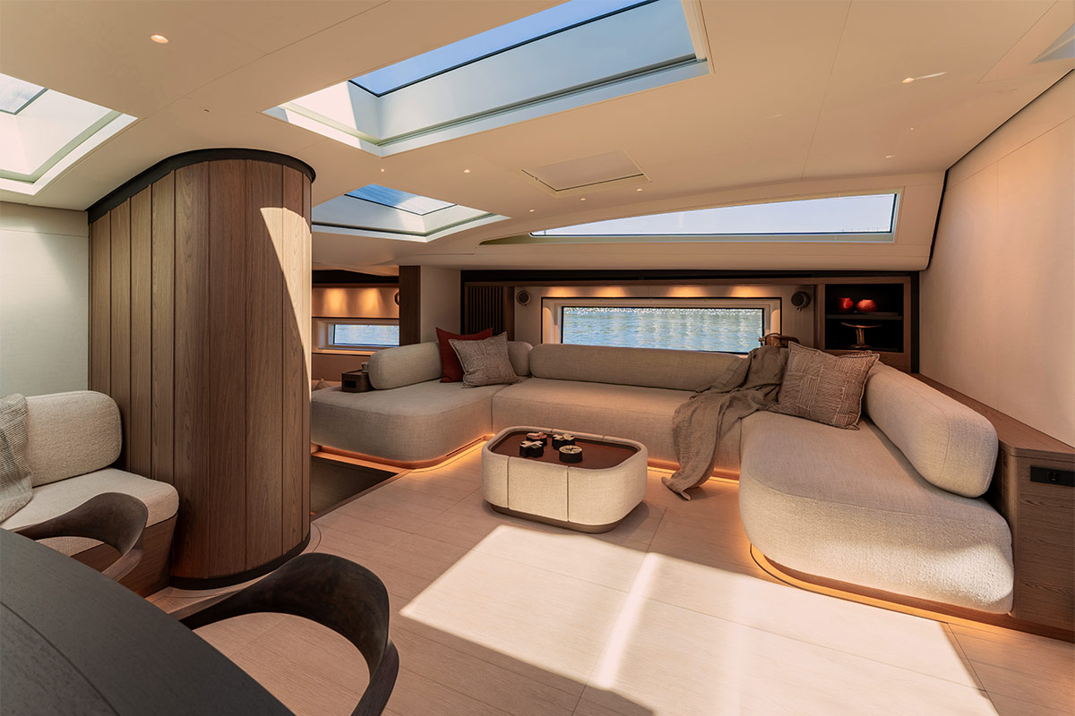 Le pont de plain-pied et le roof bas confèrent au bateau une silhouette élégante et racée, tout en garantissant une navigation performante. L’intégration soignée des puits de lumière et des fenêtres optimise la luminosité naturelle sous le pont, renforçant l’impression d’ouverture et la fluidité entre les espaces intérieurs et extérieurs.