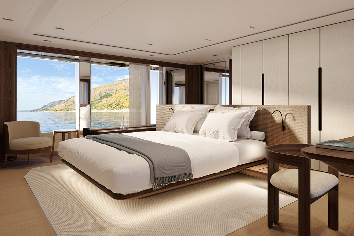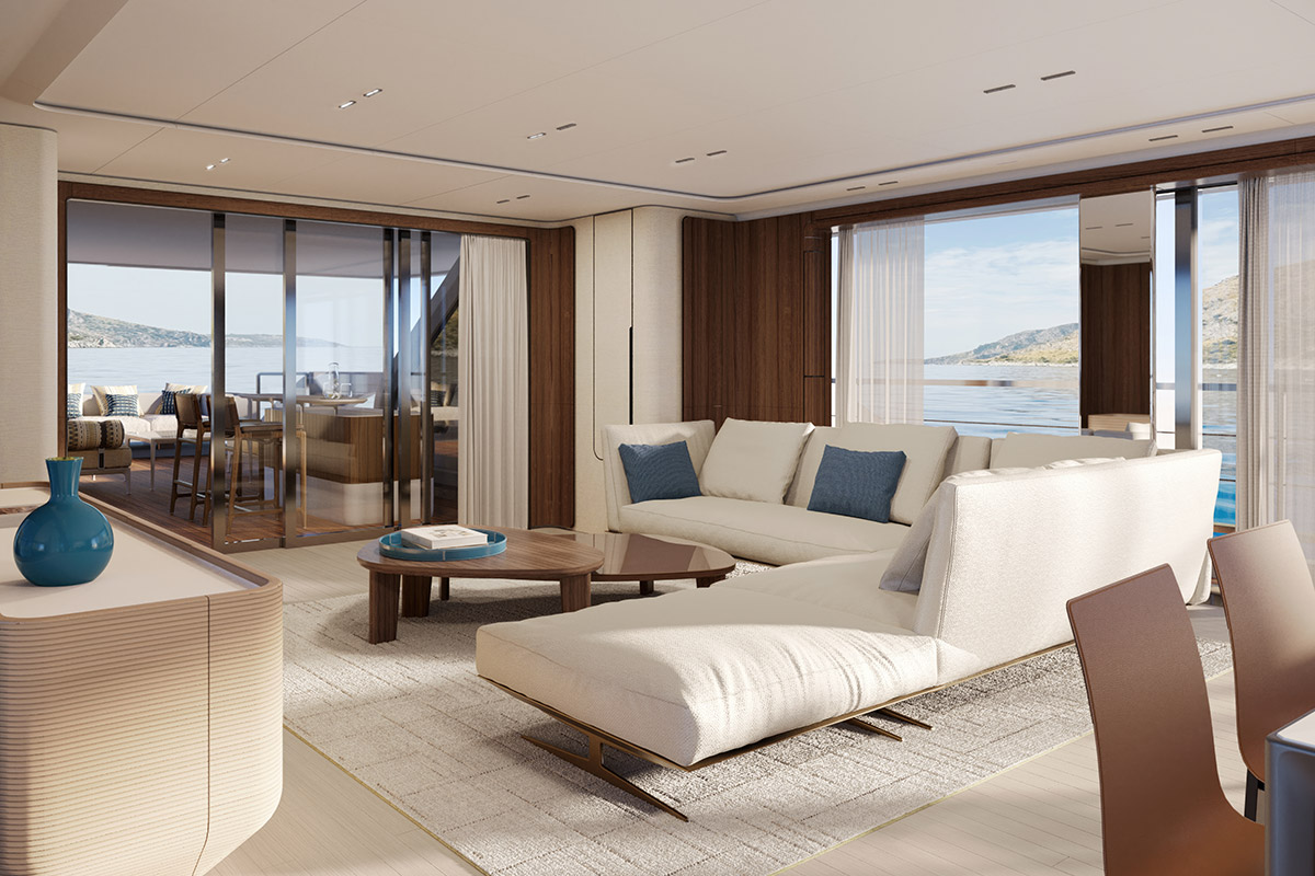 Dans le salon principal, les grandes baies vitrées laissent entrer la lumière naturelle. Les larges fenêtres latérales du coin repas amplifient la sensation d’espace sans obstruer la vue sur la mer, sublimée par l’alternance de surfaces ivoire aux textures de lin fluides et d’inserts en bois aux tons plus soutenus. La cuisine est accessible par un office situé à bâbord du salon, tandis qu’à tribord, le hall dessert la zone nuit et la suite propriétaire.