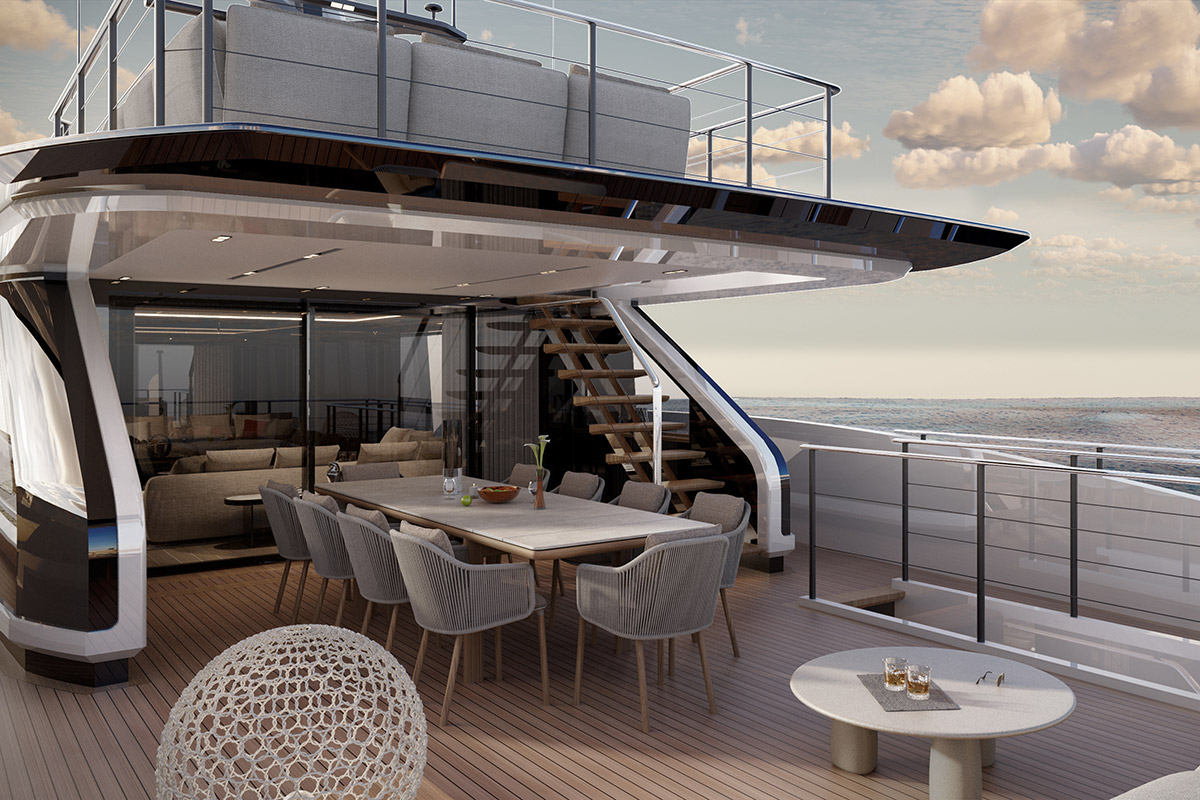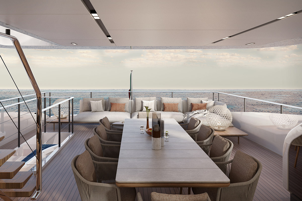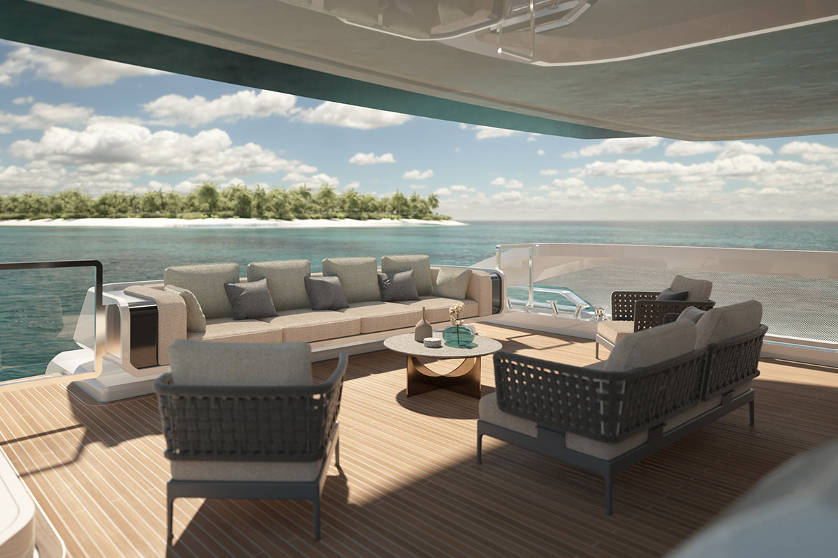 Une large porte coulissante relie la terrasse au sky lounge. Ce dernier, entouré sur trois côtés par des fenêtres coulissantes, crée une continuité immersive entre ciel et mer. L’espace de 25 m² à l’avant comprend un grand canapé en U avec rangements intégrés. Un espace bien-être avec bain à remous est également disponible en option. Le pont soleil de 30 m², équipé de chaises longues et d’un mobilier modulable, est conçu pour la détente en plein air.