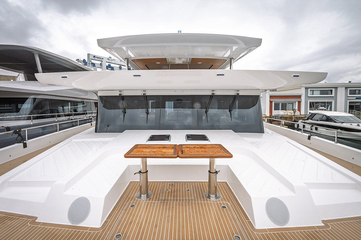 Le vaste flybridge ouvert dispose de quatre espaces de détente distincts et offre la possibilité d’intégrer un jacuzzi, un cinéma en plein air, des sièges massants, de grands bains de soleil, et bine plus encore…