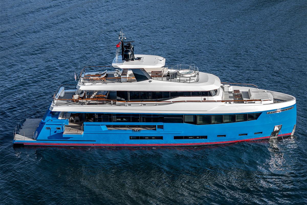 Construit selon la classification RINA, avec une coque en acier à semi-déplacement et une superstructure en aluminium, ce yacht dispose d’une autonomie transatlantique de 3 800 mn à 11,5 nœuds. Sa coque d’un bleu particulièrement surprenant et ses lignes de flottaison rouges sont un clin d’œil au sport automobile.