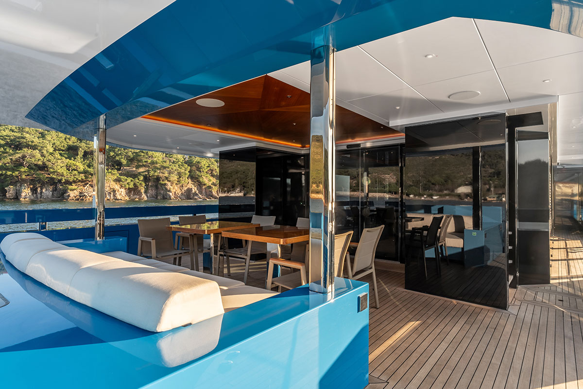 Le skylounge, spacieux et polyvalent, est l’endroit idéal pour profiter de la lumière naturelle grâce à ses fenêtres allant du sol au plafond, offrant une vue extraordinaire depuis le bar et le salon, avec des portes coulissantes en verre permettant un accès direct à l’espace repas depuis le pont. Le salon du pont principal, aéré et lumineux, offre un espace de détente alternatif avec un canapé en L et une table à manger pouvant accueillir jusqu’à 10 convives.