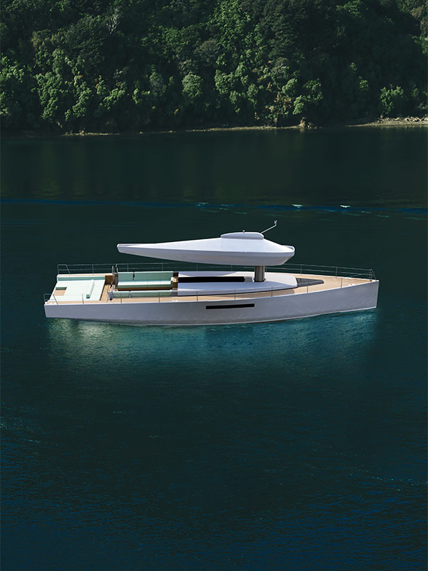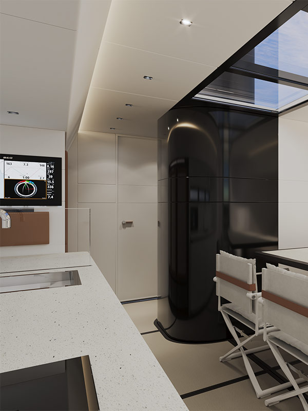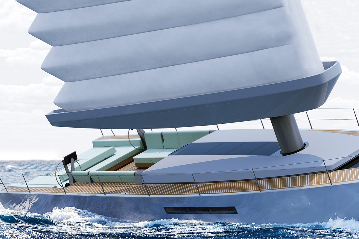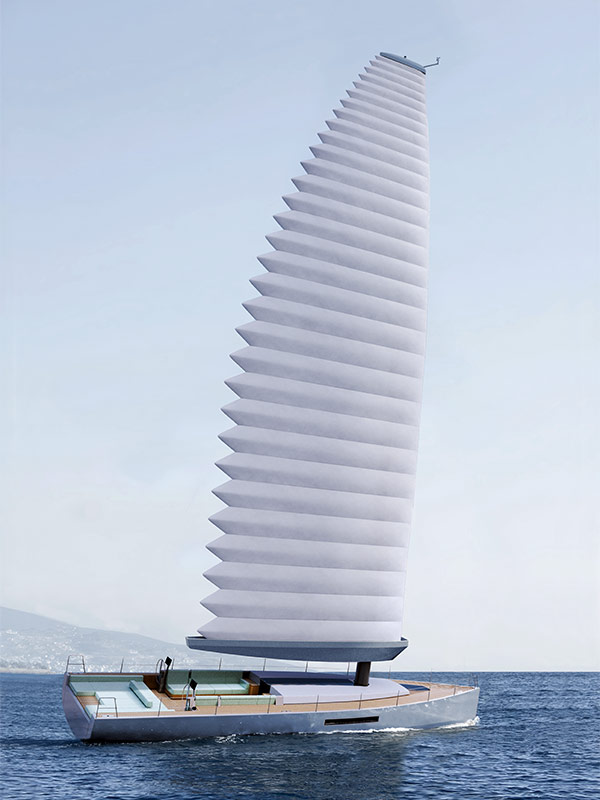 Grâce à la solution de propulsion vélique Wisamo, développée pour pouvoir se régler automatiquement en fonction du cap suivi et de la force du vent, nul besoin d’être expert dans les manœuvres. La gîte peut aussi être asservie afin de rendre la navigation à la voile plus confortable. Ceci étant, ce yacht sera parallèlement équipé d’une propulsion secondaire électrique afin de faciliter les approches portuaires ou les journées sans vent.