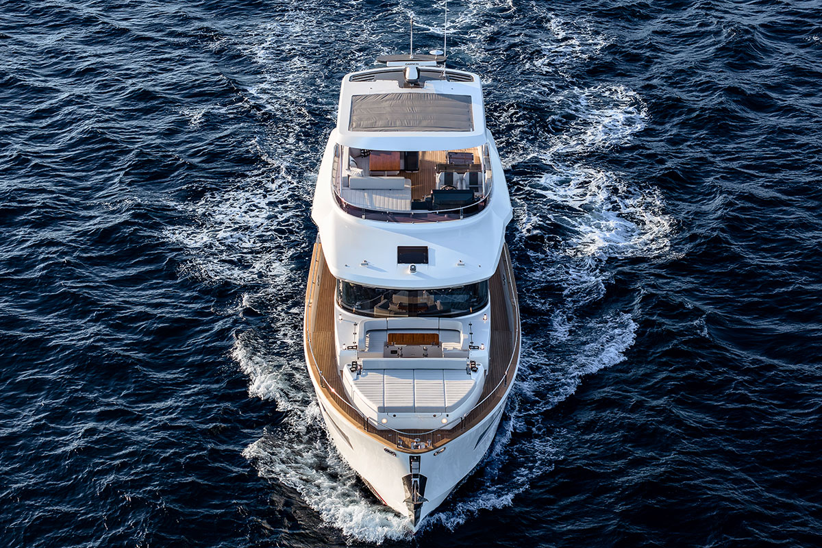 Les lignes contemporaines, initialement conçues par Frers Naval Architecture, ont été soigneusement revisitées par les designers de Sirena, tout en conservant les éléments du design et l’ADN de la marque. Parmi ces éléments, on peut citer l’étrave aplombée, la plateforme de bain allongée et le contraste saisissant entre les vastes surfaces vitrées foncées et le blanc éclatant de la coque. À l’intérieur, des selleries luxueuses et des matériaux haut de gamme durables, sélectionnés pour leur esthétique, leur confort et leur praticité en milieu marin.