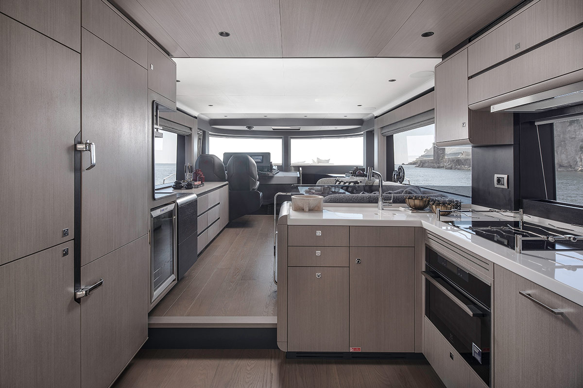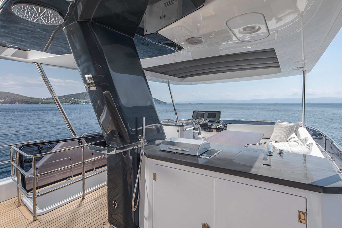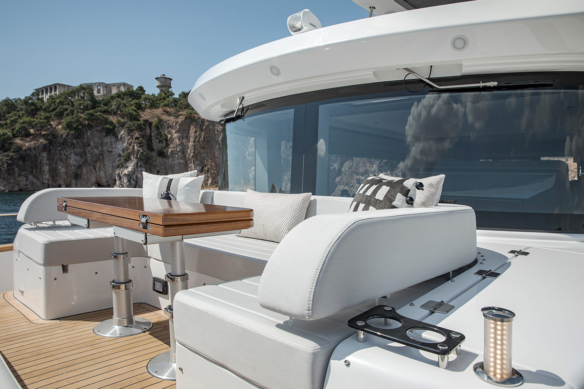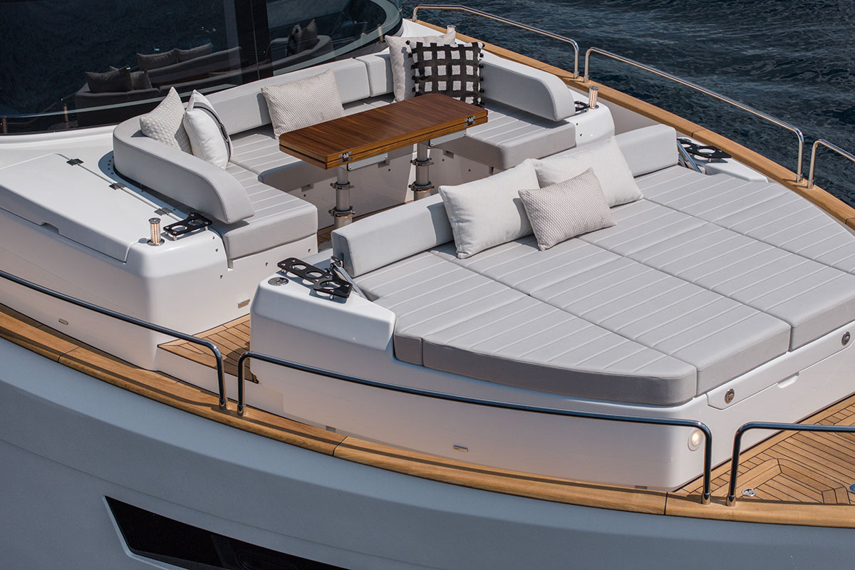 De plus, l’un des éléments les plus emblématiques du Sirena 58, le flybridge, a été amélioré tant au niveau du design que des fonctionnalités, devenant ainsi un espace ombragé idéal pour se détendre à bord. Le tableau de bord et les sièges du pilote ont été modernisés : un nouveau plan de travail en Corian élégant a été intégré au bar, et le bain de soleil est doté d’un nouvel appui-tête convertible.