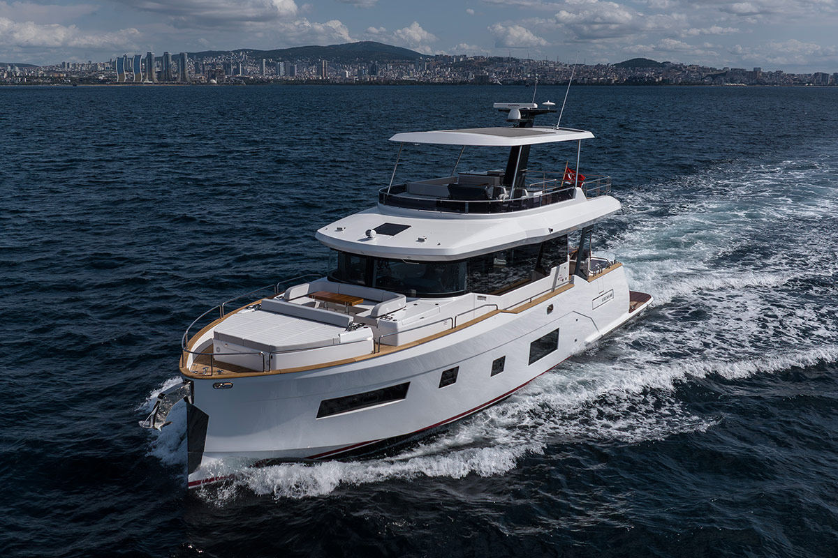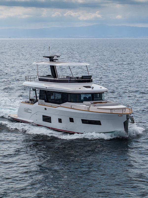 Développé pour remplacer le Sirena 58, ce nouveau bateau de 19,45 mètres offre de nombreuses améliorations par rapport au modèle précédent. Parmi celles-ci : des fenêtres plus grandes, un flybridge redessiné et modernisé, des espaces extérieurs nettement plus grands à l’avant comme à l’arrière, ainsi qu’un volume intérieur accru. Il offre plus d’espace pour se détendre, des rangements optimisés et une esthétique plus moderne.