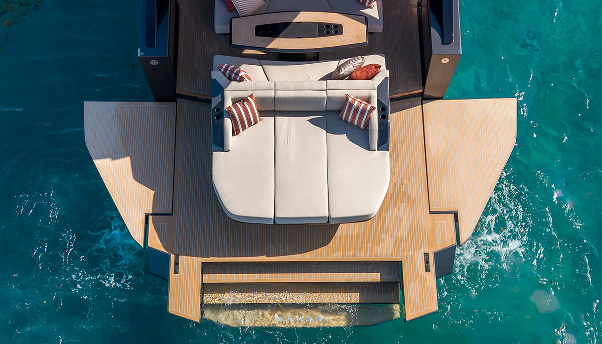 La philosophie de Manari est simple : les moments passés sur l’eau doivent être inoubliables. Au mouillage, toute la partie arrière du bateau se transforme en une vaste plateforme de baignade et de détente. Des marches descendent dans l’eau pour un accès aisé et les pavois dépliables agrandissent considérablement l’espace de vie.