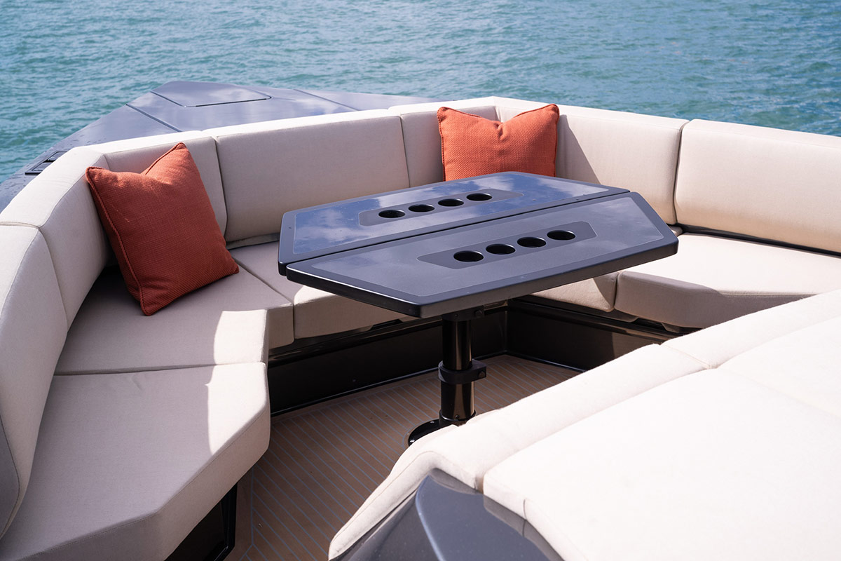 Un luxueux bain de soleil domine la plateforme arrière, laissant place à un élégant coin salon pour six personnes autour d’une table ovale, à l’ombre bienvenue du hard-top. Les sièges sont revêtus d’un tissu extérieur résistant, conçu spécialement pour Manari. Un bar, un grill et un réfrigérateur s’intègrent harmonieusement à cet espace, offrant tout le nécessaire pour des réceptions conviviales.