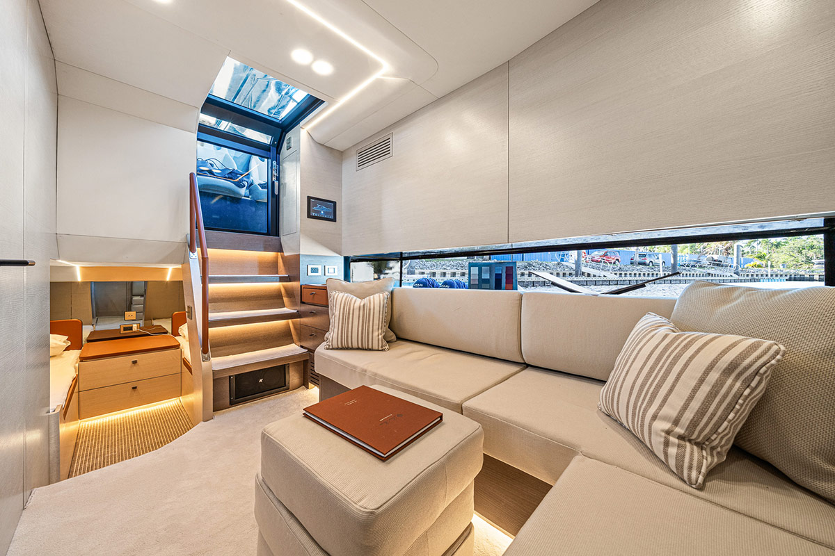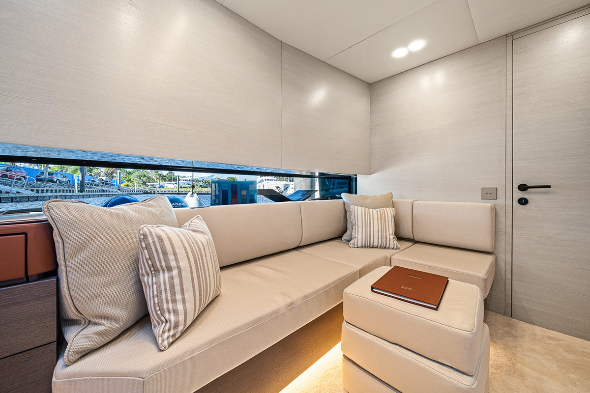 En descendant du cockpit, on accède à un salon accueillant offrant une hauteur sous barrot de 2,20 mètres, décoré dans des tons neutres et contemporains. Des canapés confortables longent la coque et le salon est baigné de lumière naturelle grâce à la baie vitrée qui s’étend sur toute la longueur du bateau. Un grand téléviseur encastré est disponible en option, ainsi qu’un coin café et un réfrigérateur.