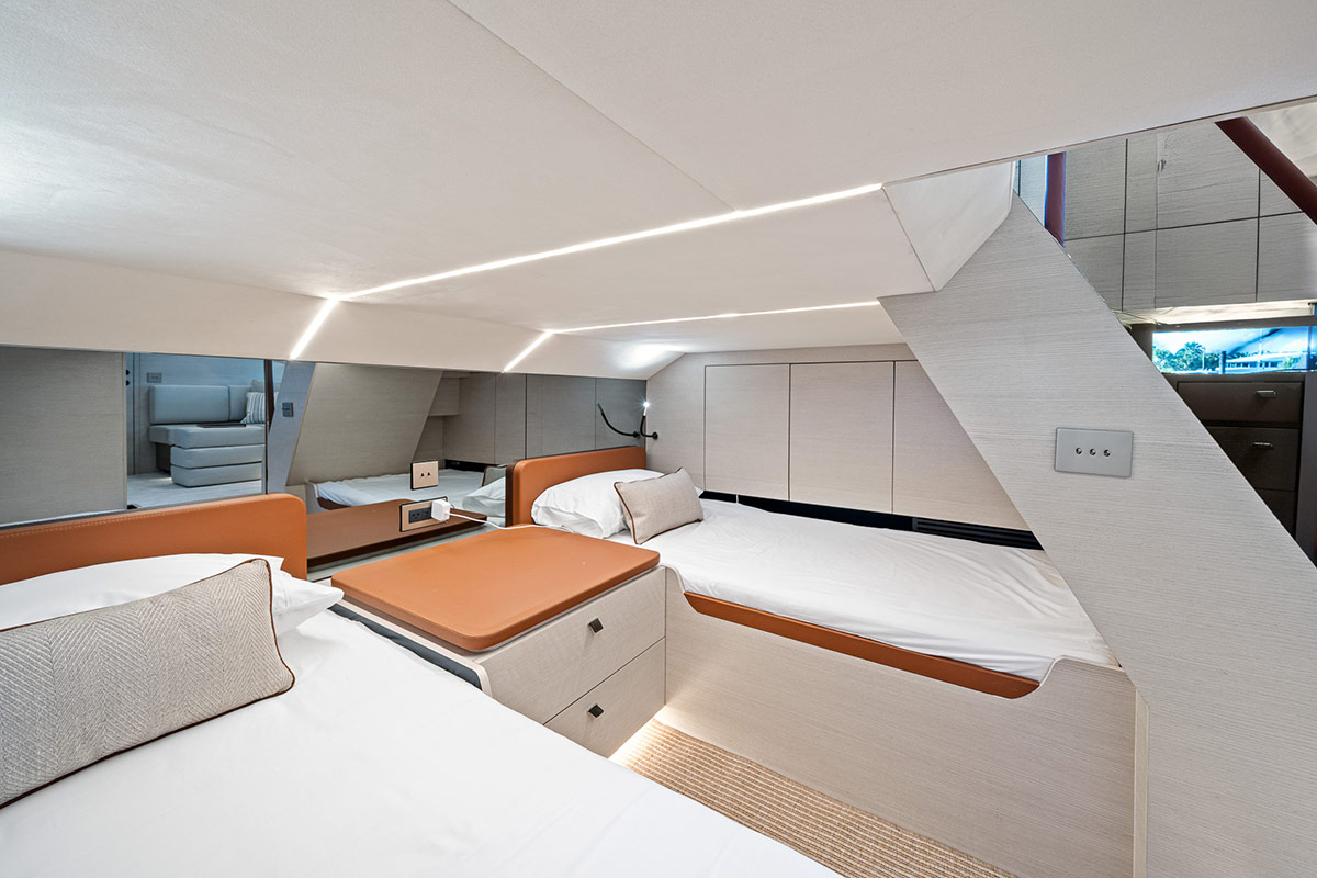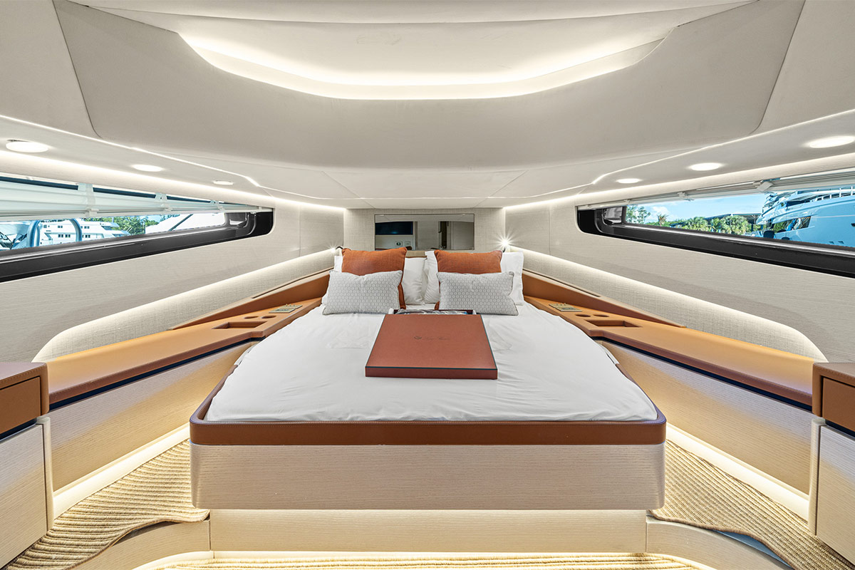 Sous le pont, on retrouve la même harmonie entre fonctionnalité et confort. Les plus beaux matériaux naturels des intérieurs Loro Piana se côtoient dans tout le yacht, ainsi que de magnifiques boiseries sur mesure signées Tabu et des cuirs italiens haut de gamme. Une attention au détail qui caractérise Manari.