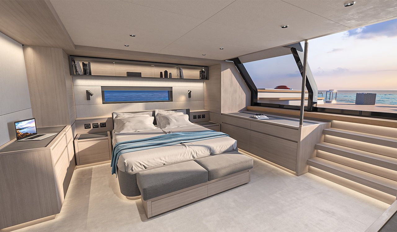 L’une des caractéristiques de la version Beach est le panneau coulissant en verre qui permet d’accéder directement au pont arrière depuis la cabine principale, une solution qui offre des vues panoramiques de type « villa sur la mer », plus typiques de certains voiliers.