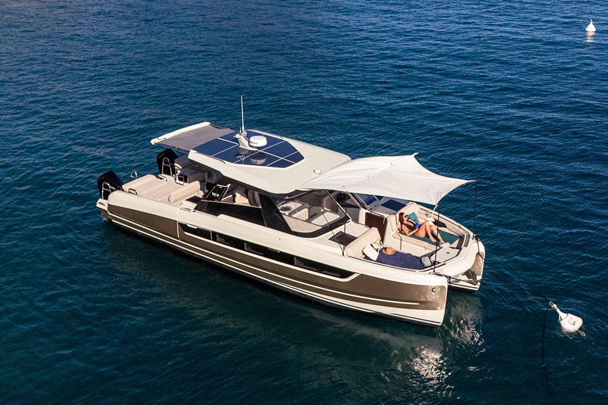 Avec cette motorisation, ce catamaran atteint désormais une vitesse de pointe dépassant les 40 nœuds. Le système combine une embase orientable indépendante et des hélices contrarotatives. Associé au pilotage joystick, il assure une fluidité totale lors des manœuvres au port. Le moteur dispose d’une transmission automatique à deux vitesses, une première dans l’industrie, et promet un entretien réduit.