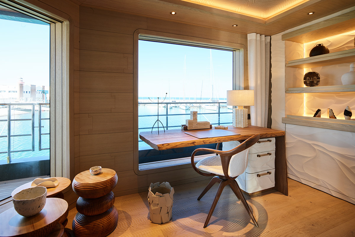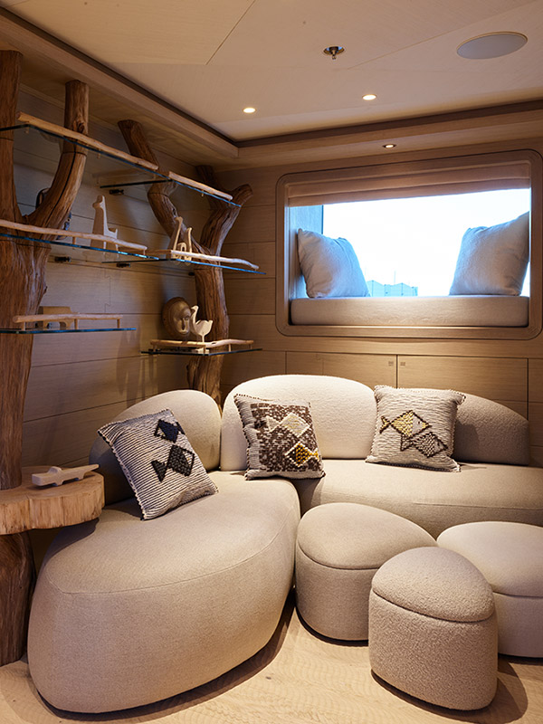 Le système audiovisuel est tout aussi sophistiqué ! Compte tenu notamment de la longueur du pont arrière. De type explorateur, utilisé pour ranger les annexes et les équipements nautiques, cet espace a été conçu comme une zone de divertissement modulable. Il reçoit cinq enceintes actives haute puissance avec caissons de basses, un écran de rétroprojection motorisé de 98 pouces qui se déploie depuis le surplomb du pont, et un projecteur rangé dans une valise de transport.