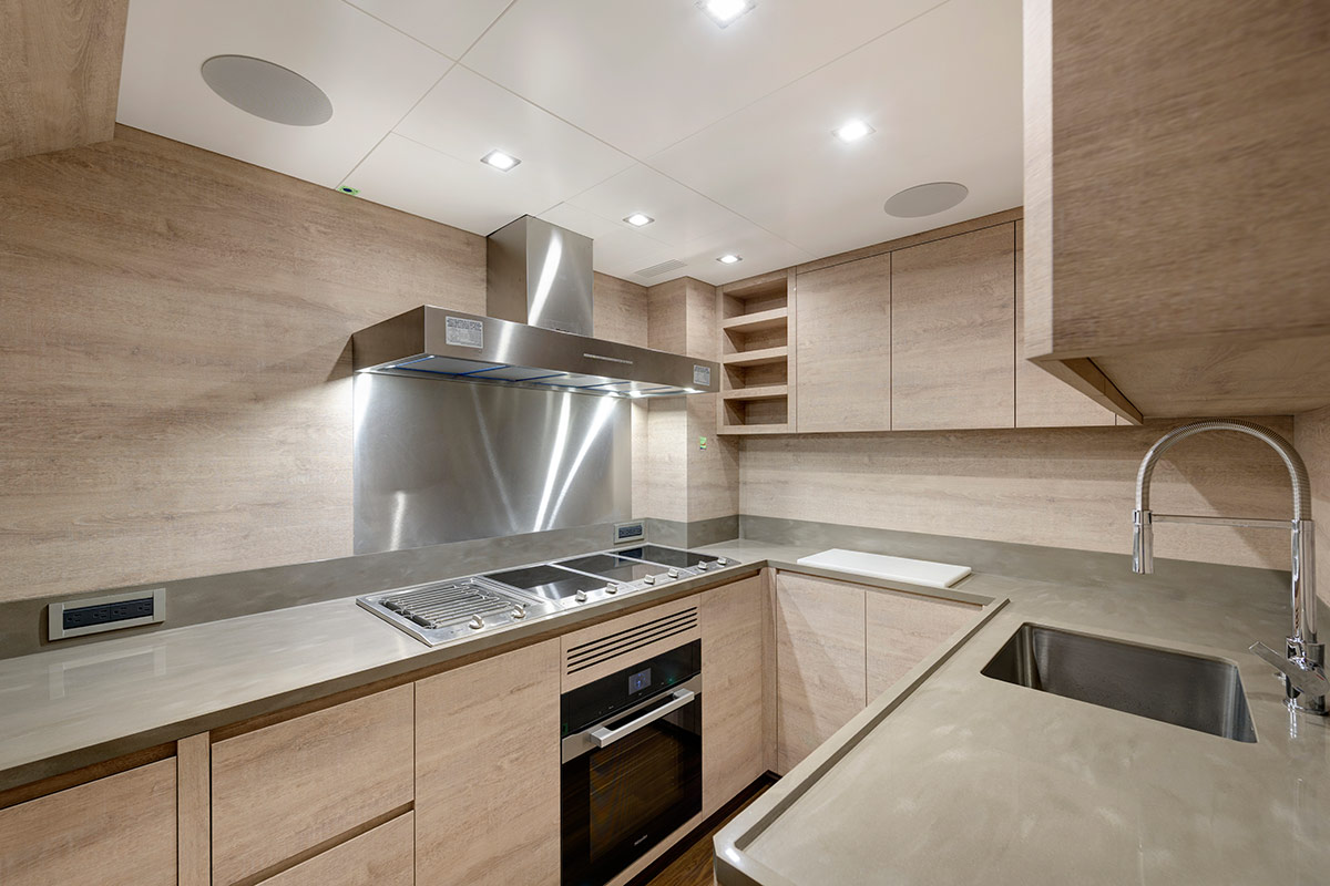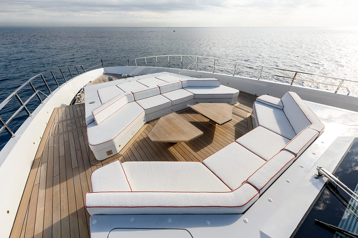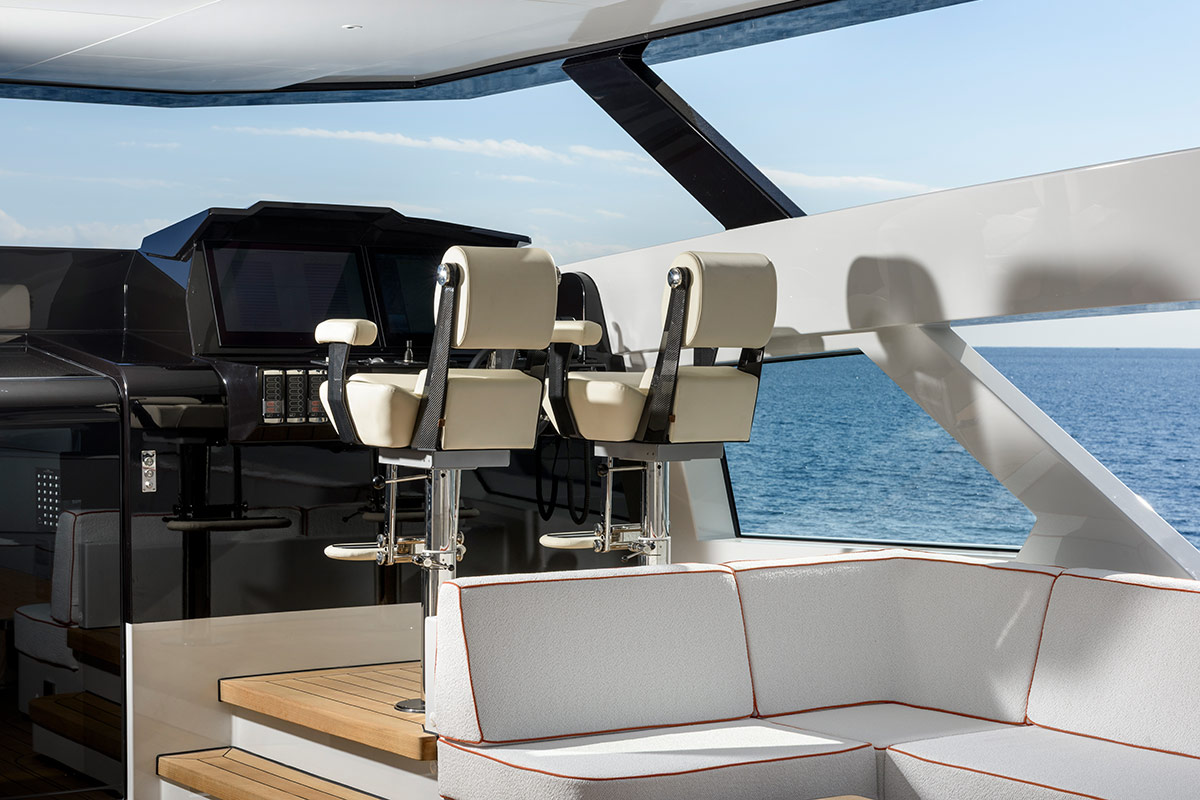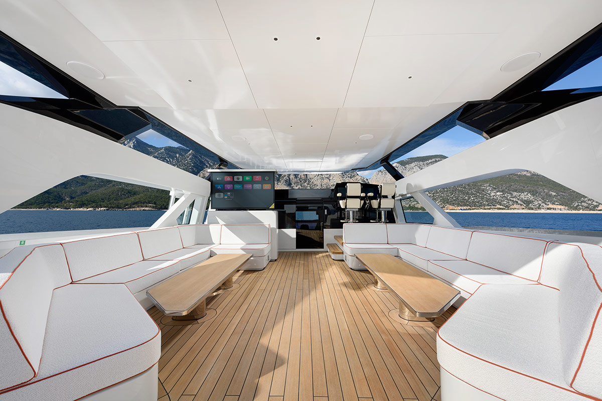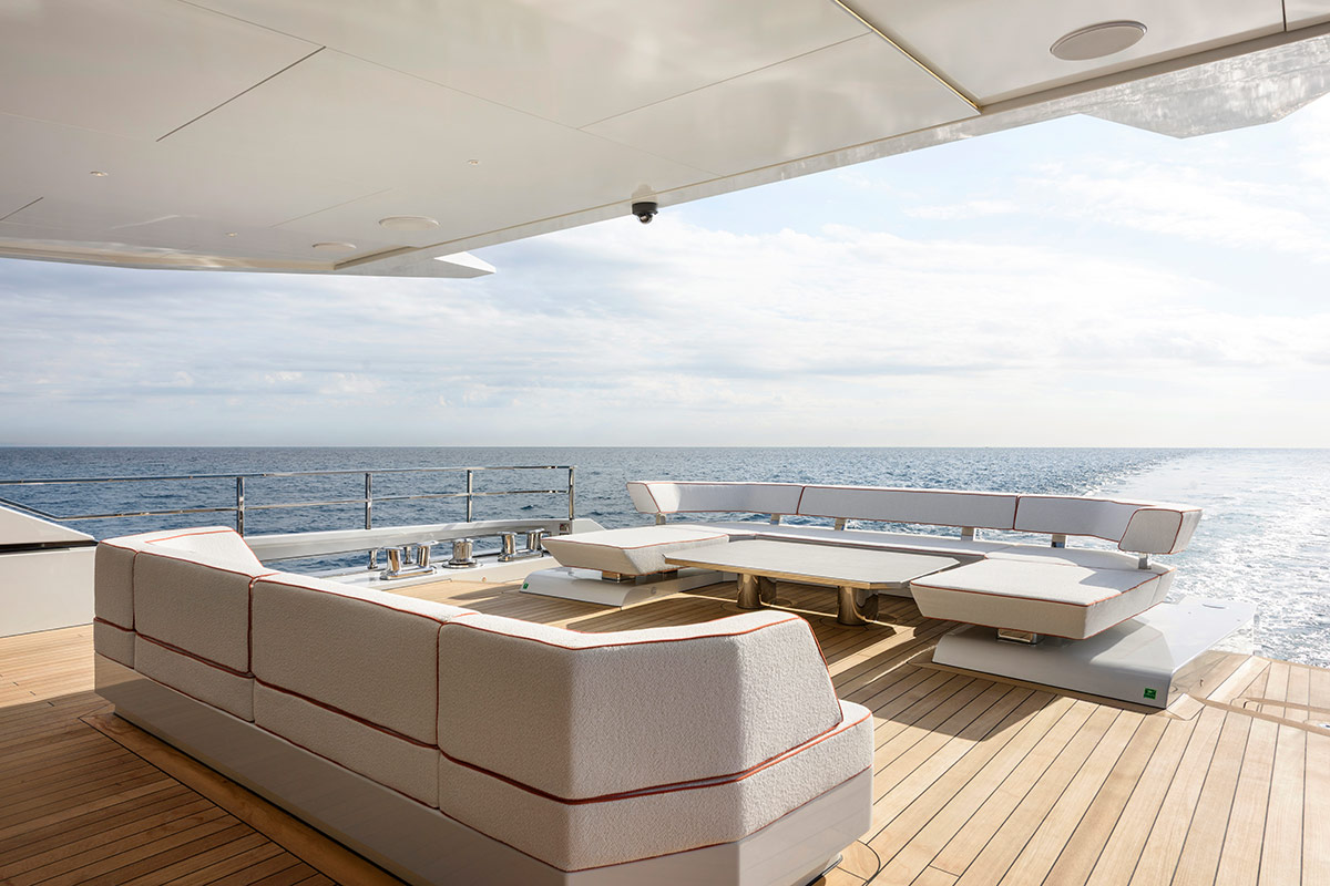 À l’arrière, le pont principal poursuit le concept de vie flexible, offrant des espaces couverts et découverts avec éclairage intégré, système audio discret et écran de cinéma escamotable. Un espace idéal aussi bien pour des après-midis de détente que pour des soirées animées à bord.