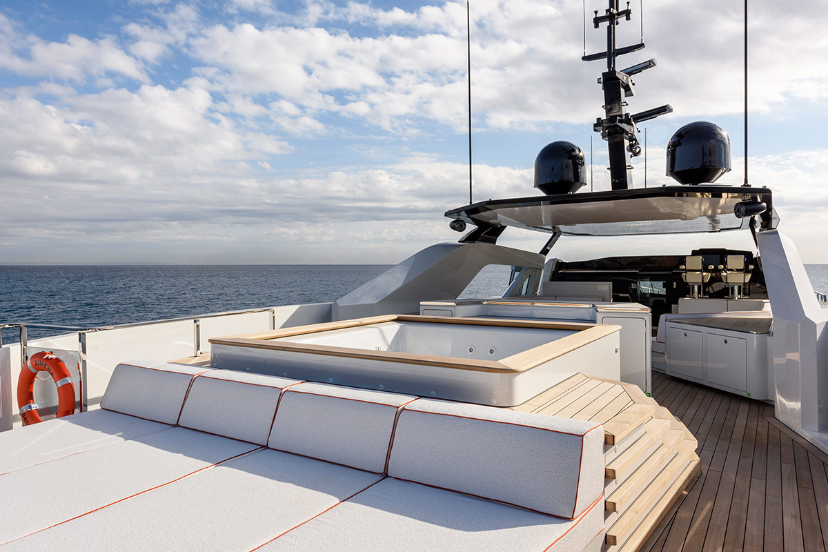 Les espaces extérieurs sont conçus avec un objectif clair : le plaisir en toute simplicité. Le vaste pont soleil, d’une superficie de plus de 50 m², allie confort ombragé sous un élégant hard-top noir et espaces ouverts pour bronzer autour du jacuzzi. Un bar entièrement équipé, de nombreux sièges et un grand écran escamotable transforment cet espace, d’un havre de paix en journée à un lieu de réception en soirée, tandis que les deux sièges de pilotage offrent une vue imprenable en navigation.