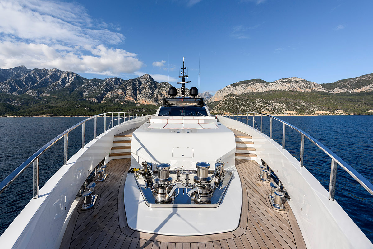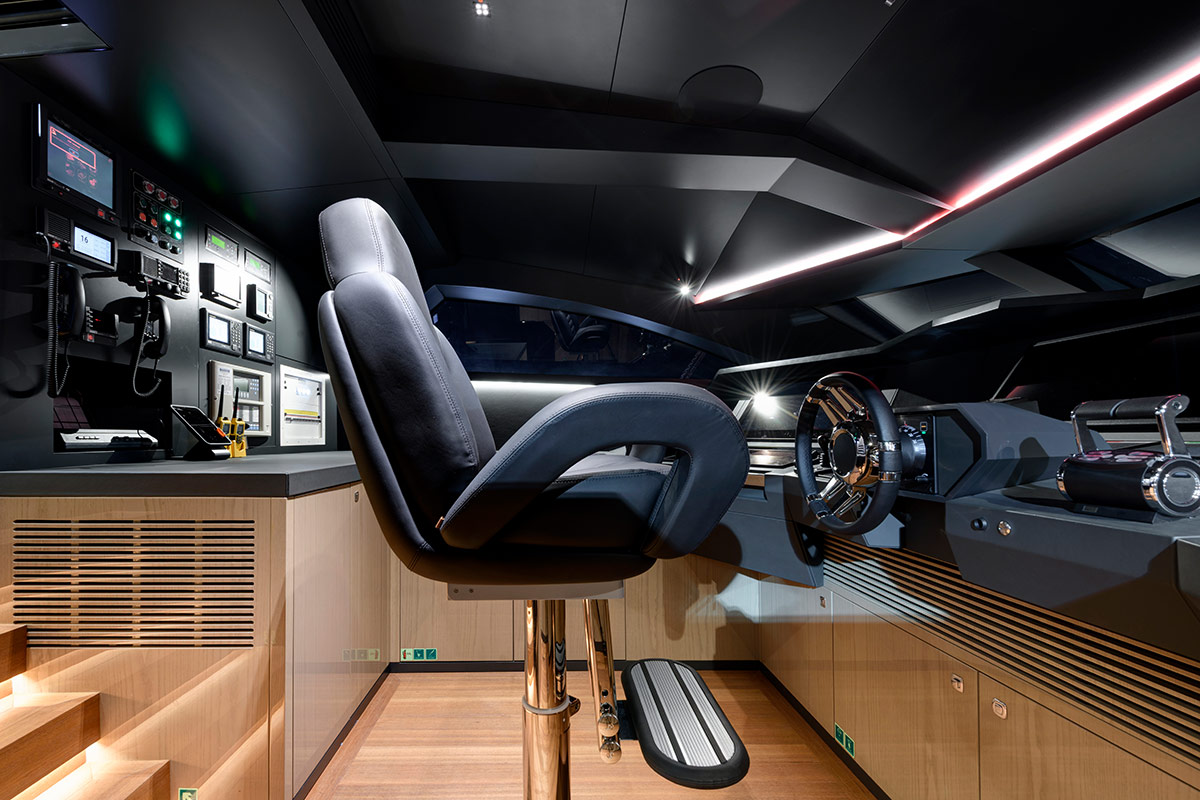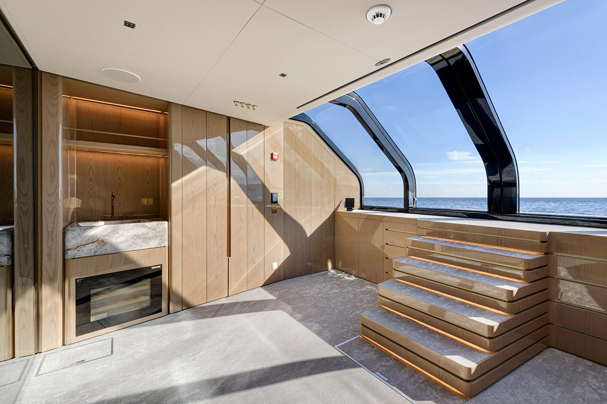Quant au beach club, il devient le cœur de la vie quotidienne. La large plateforme en teck invite à un contact direct avec la mer, tandis qu’une plateforme hydraulique centrale facilite l’accès à la baignade et la mise à l’eau des jouets nautiques. Derrière le tableau arrière vitré, une salle de sport entièrement équipée enrichit l’expérience, alliant harmonieusement bien-être et loisirs dans un espace à la fois ouvert et fonctionnel.
