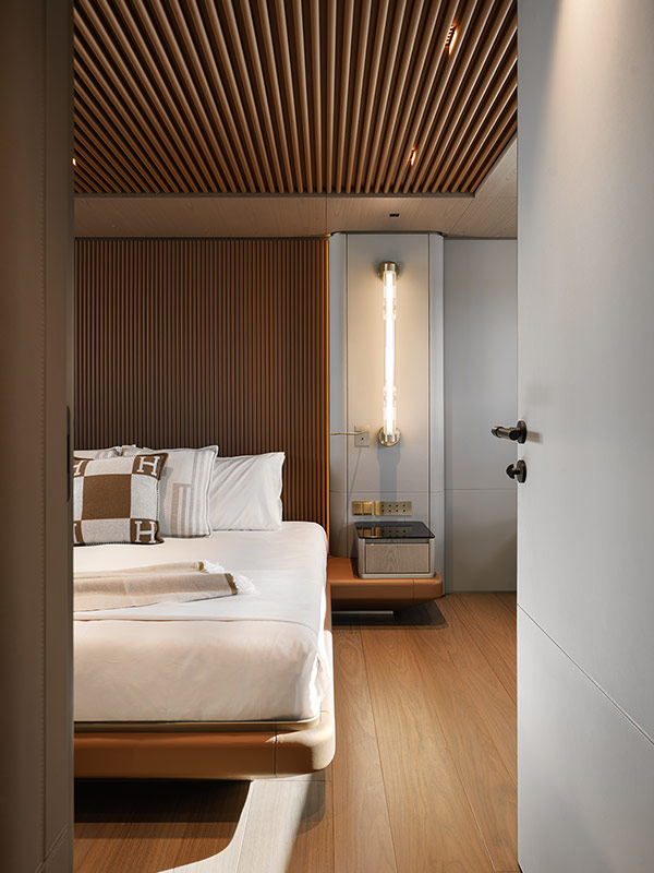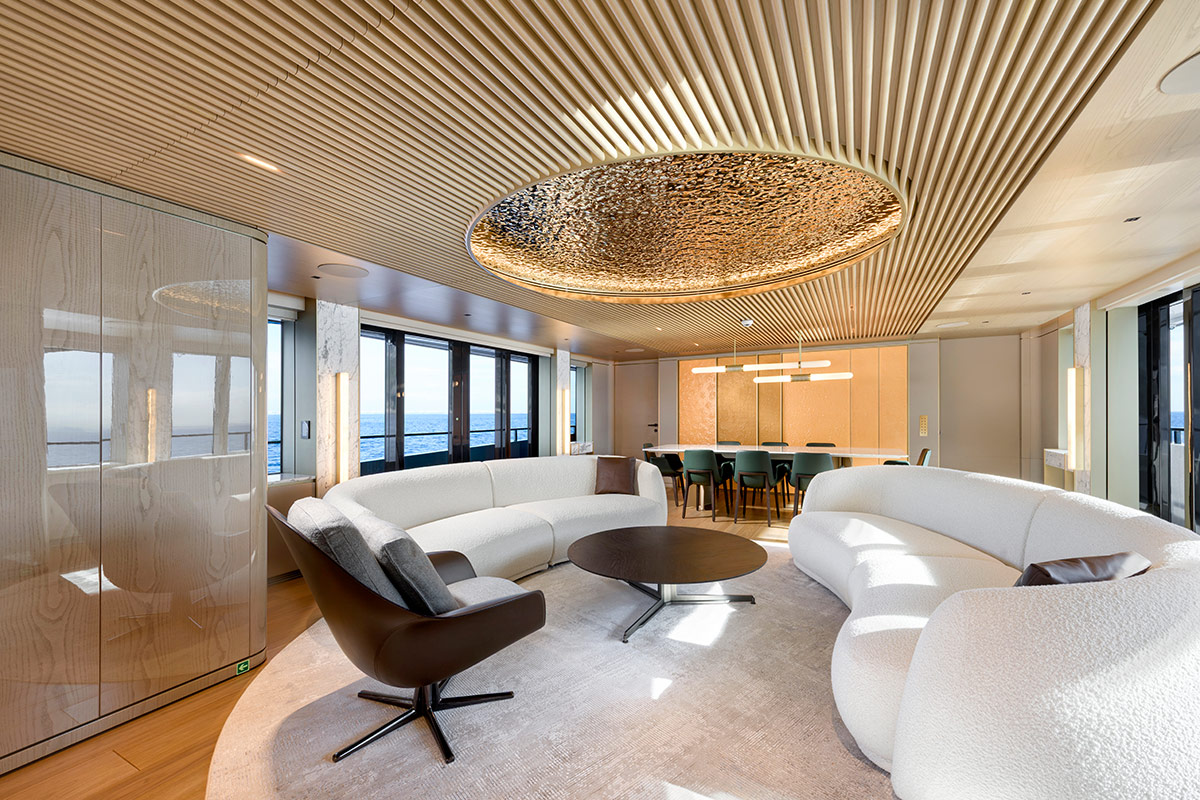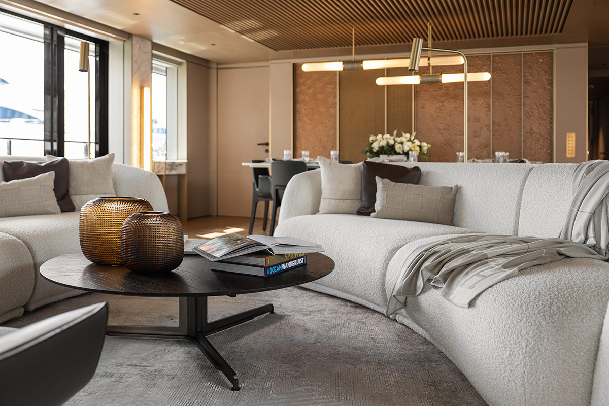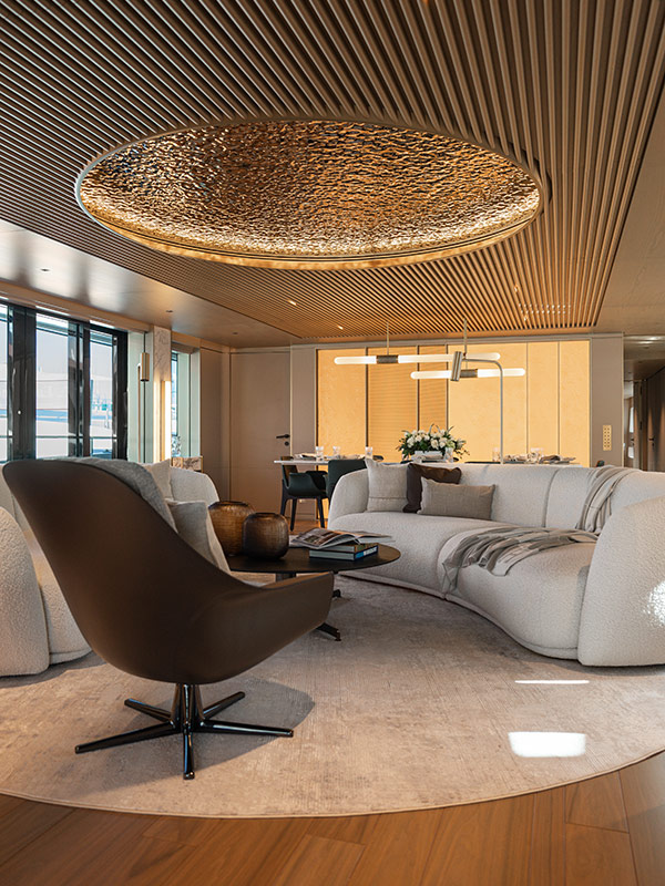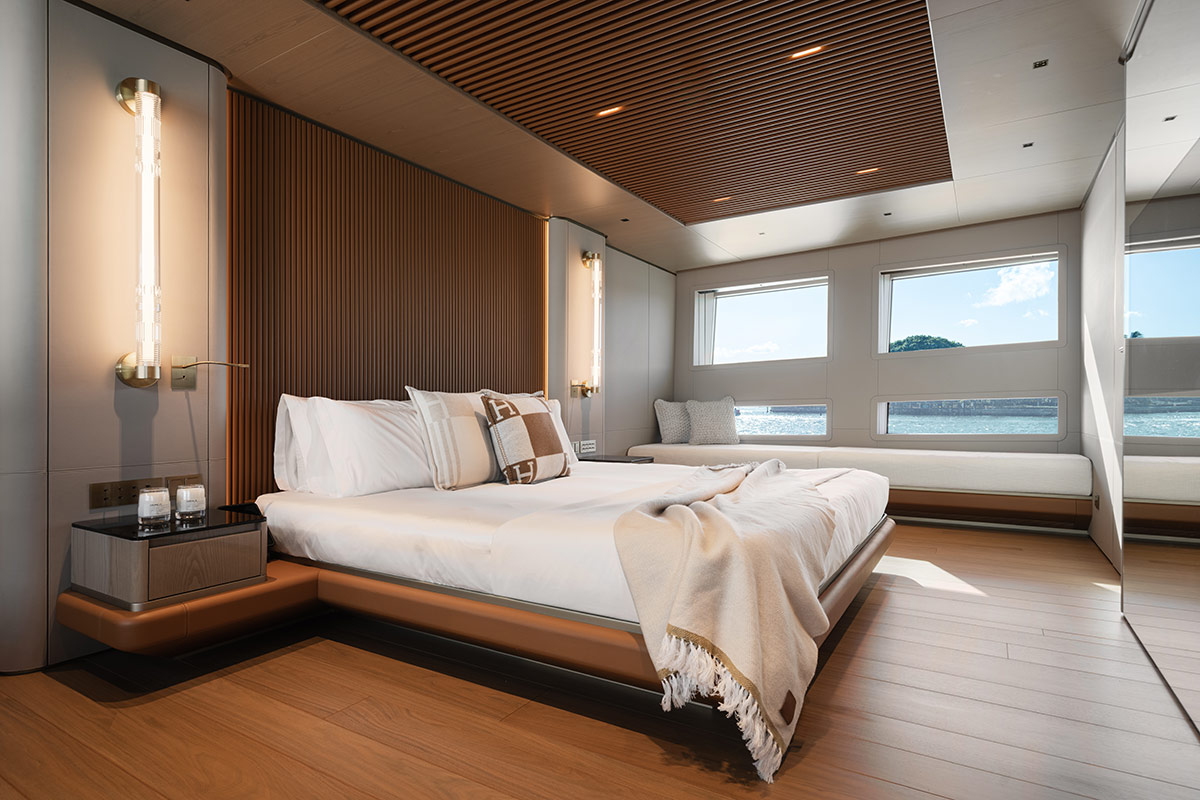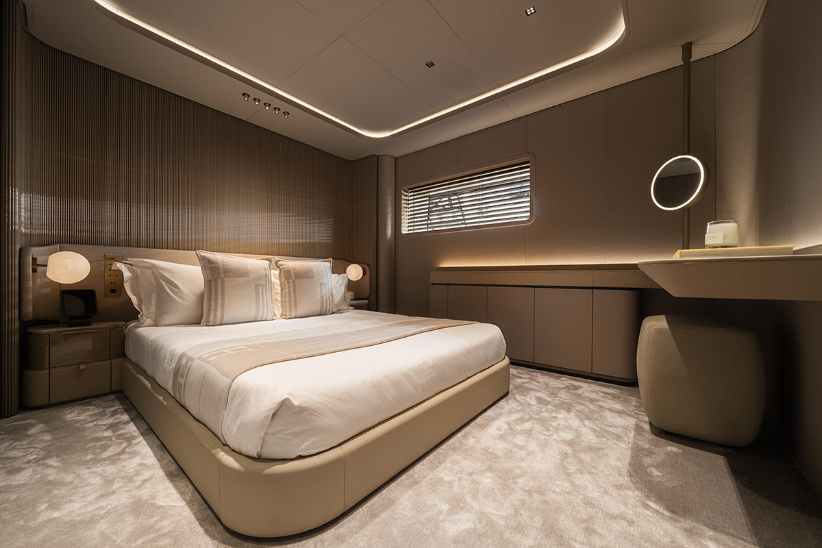 La suite propriétaire, située à l’avant du pont principal, occupe plus de 50 mètres carrés et est conçue comme un havre de paix. Des lignes épurées, de généreuses baies vitrées et des matériaux soigneusement sélectionnés confèrent à l’espace une atmosphère sereine et intime.