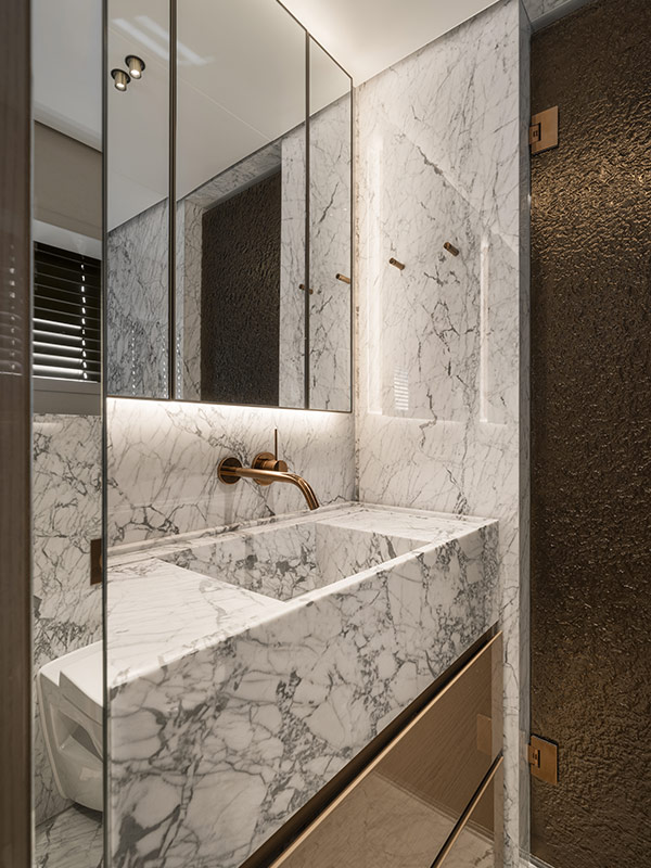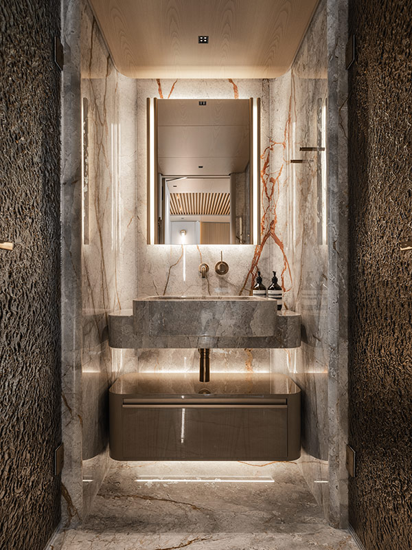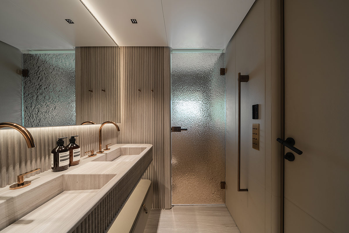 Les cabines invités reprennent le même style, avec deux cabines VIP à l’arrière et deux cabines supplémentaires à l’avant. Les matériaux, subtilement adaptés, comme le travertin veiné et le marbre Invisible Grey, confèrent à chaque espace une identité propre tout en préservant l’harmonie d’ensemble.