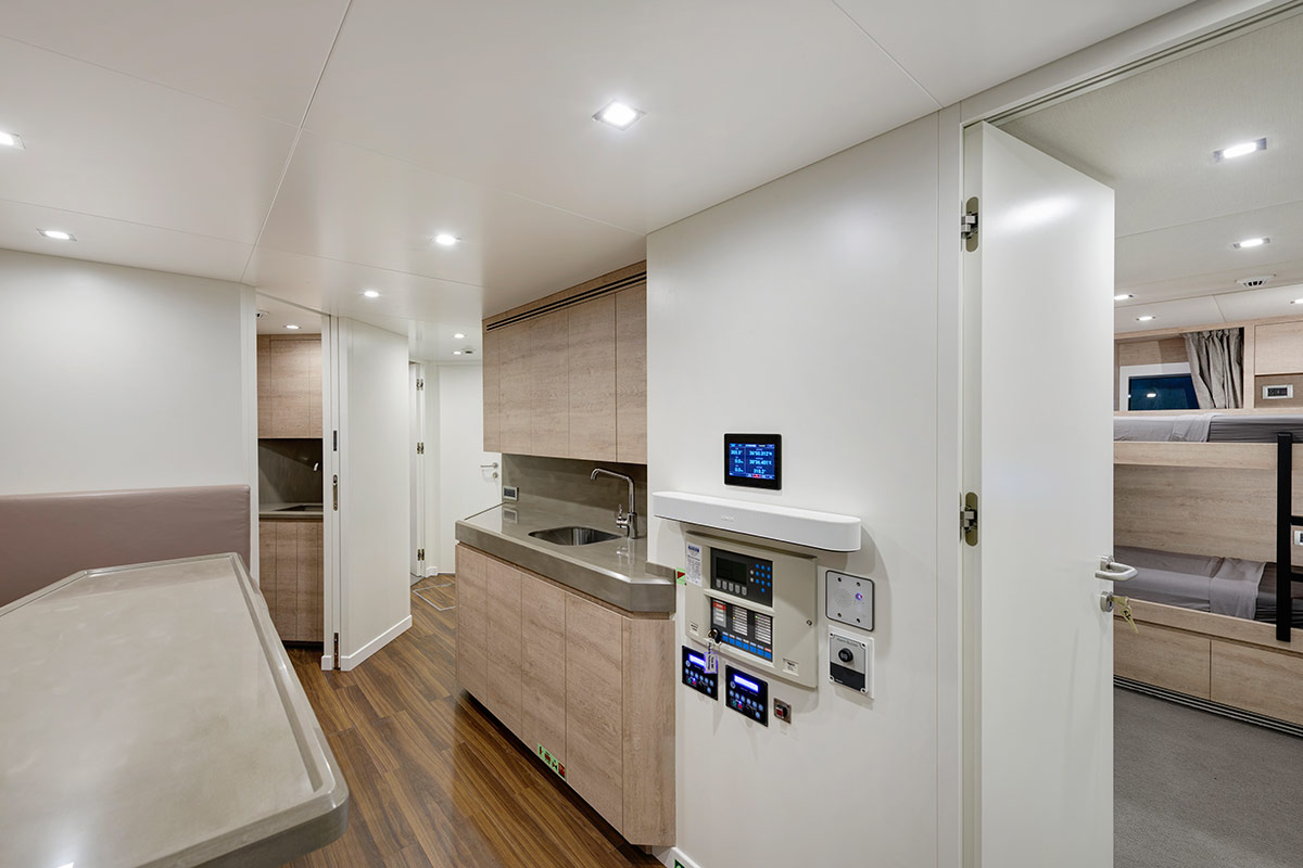 Sous la surface, sa coque à déplacement rapide offre un équilibre parfait entre vitesse et efficacité. Avec une vitesse de pointe de 22,6 nœuds et une vitesse de croisière de 20 nœuds, elle offre une grande autonomie sans sacrifier le confort. Son faible tirant d’eau de seulement 2,1 mètres renforce sa polyvalence, lui permettant d’accéder à des zones de navigation allant des Bahamas aux mouillages plus reculés et peu profonds.